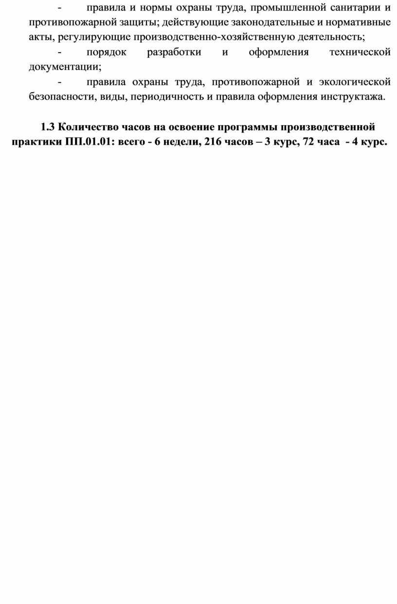 1.3 Количество часов на освоение программы производственной практики ПП.01.01: всего - 6 недели, 216 часов – 3 курс, 72 часа - 4 курс.