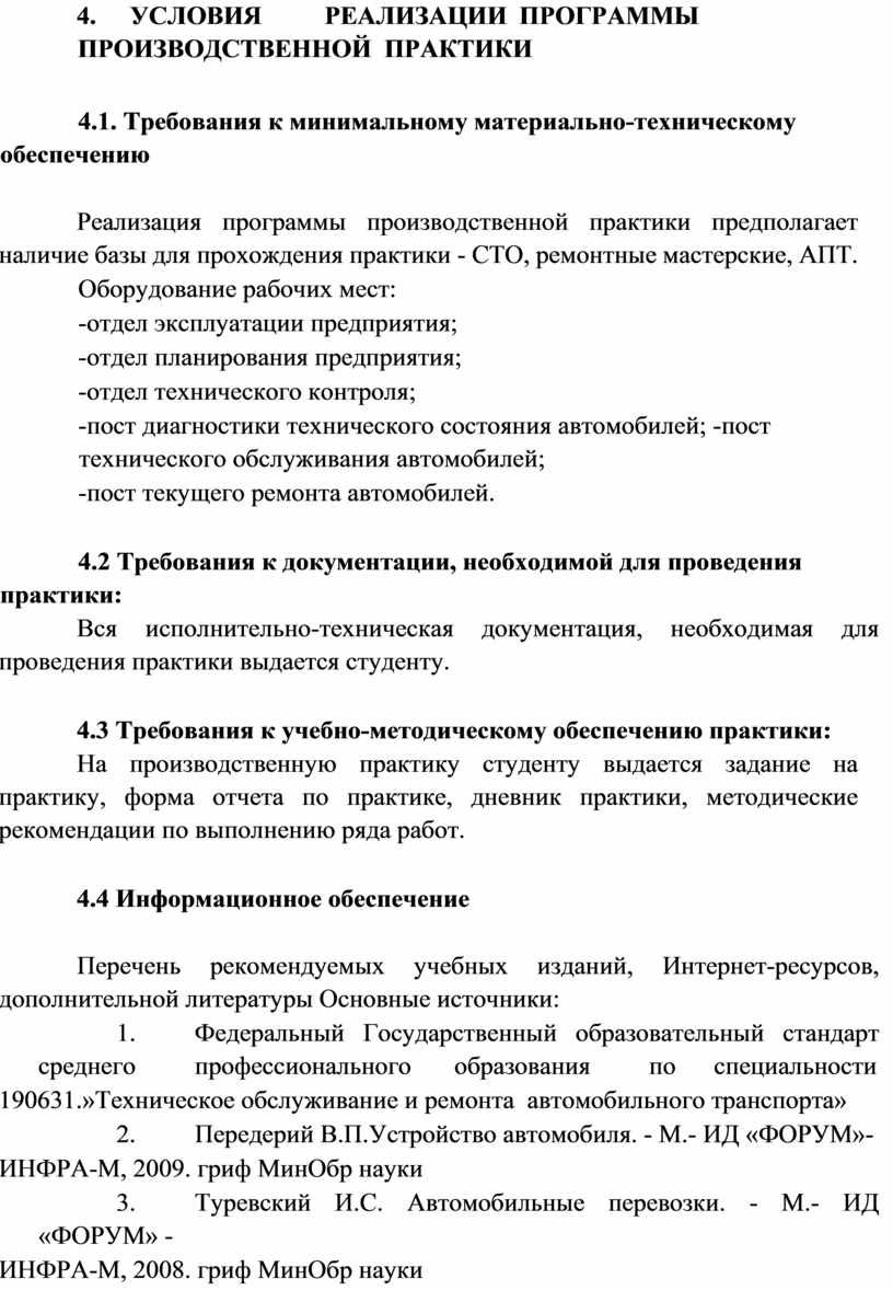 Реализация программы производственной практики предполагает наличие базы для прохождения практики - СТО, ремонтные мастерские, АПТ.