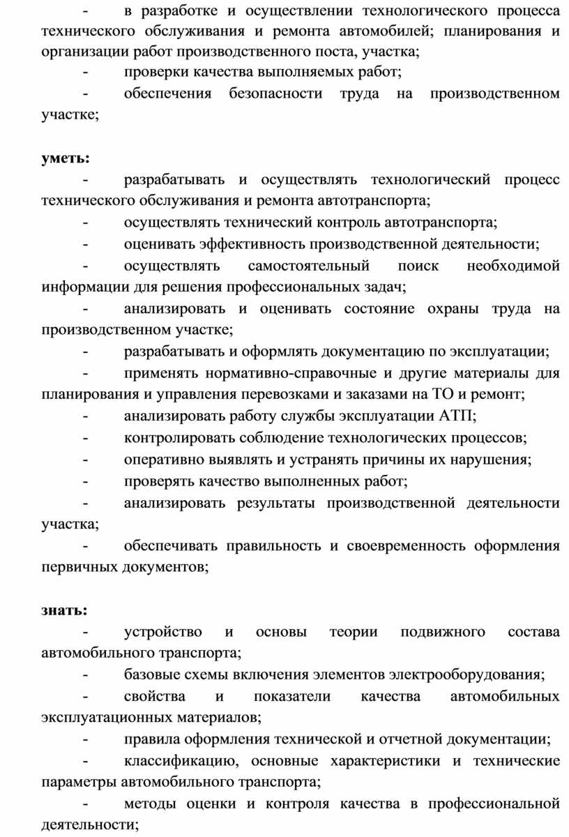 - в разработке и осуществлении технологического процесса технического обслуживания и ремонта автомобилей; планирования и организации работ производственного поста, участка;