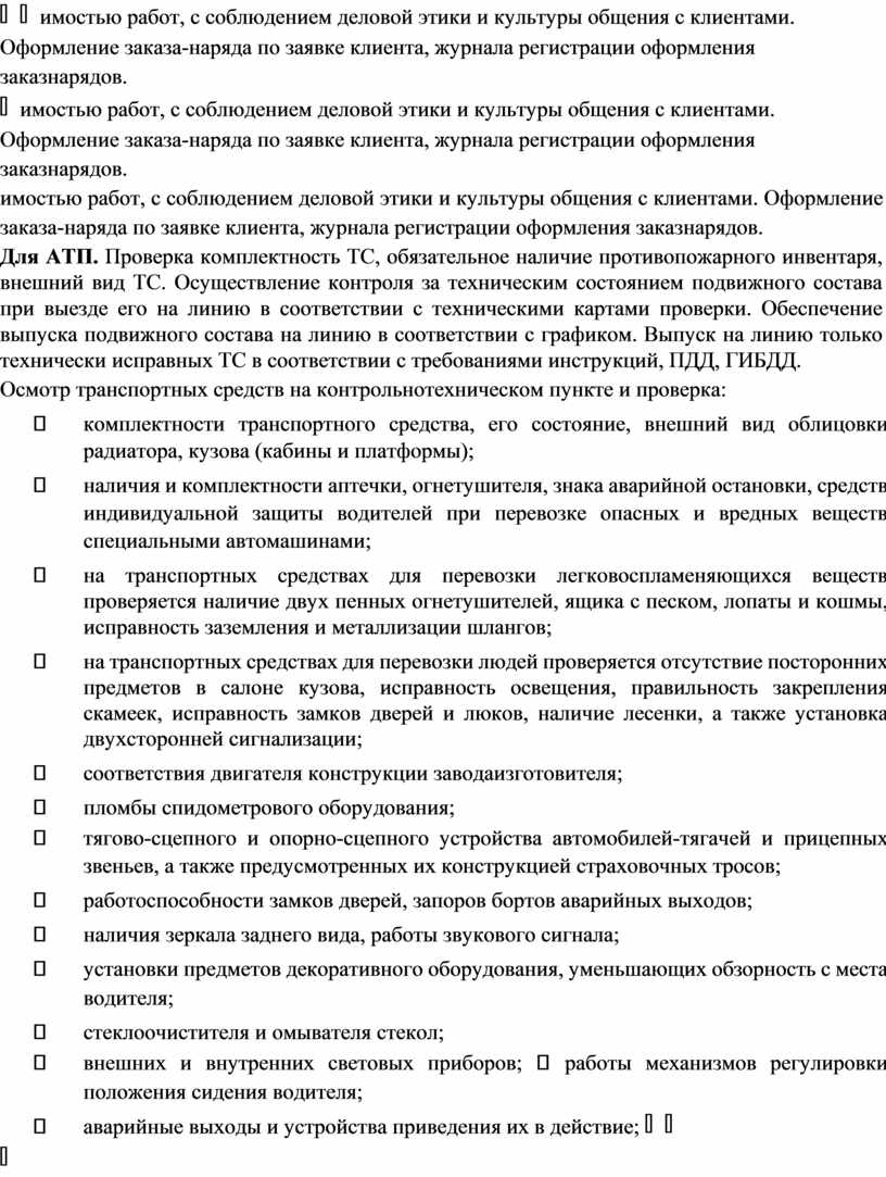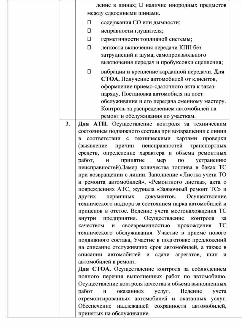 Осуществление выполнения работ по диагностированию автотранспортных средств: - оформление технической документации по выдаче и приему работы, нарядам, сменным заданиям и др.; - обеспечение правильной и безопасной организации работ (не допускается загромождение рабочих мест, проходов и проездов, прилегающих территорий); - контроль соблюдение рабочими технологических процессов, оперативное выявление и устранение причины их нарушения; - обеспечение выполнения плановых заданий в установленные сроки; - оказание помощи рабочим в замерах показателей технического состояния узлов, агрегатов, систем автотранспорта при диагностике; заполнение «Листка учета ТО и ремонта автомобилей», |