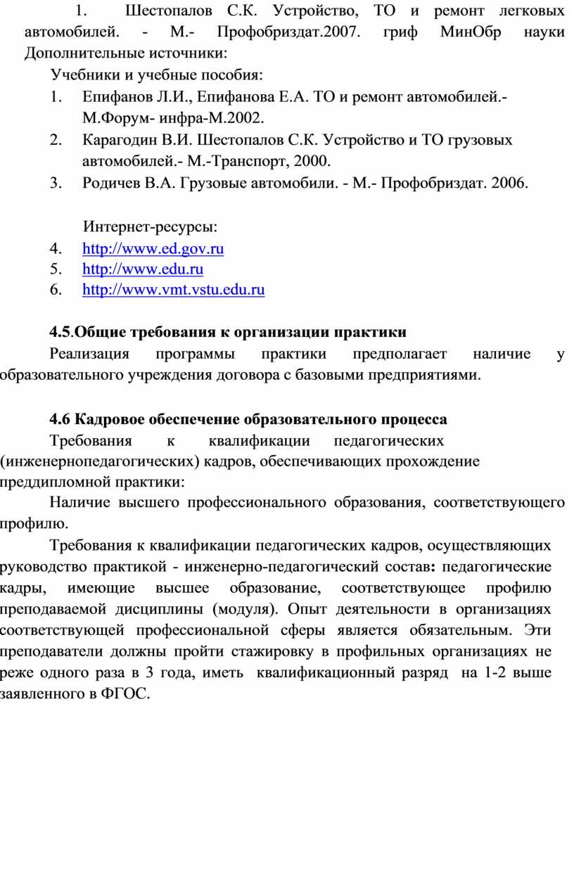 4. Шестопалов С.К. Устройство, ТО и ремонт легковых автомобилей. - М.- Профобриздат.2007. гриф МинОбр науки Дополнительные источники: