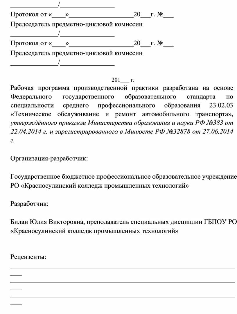 Рабочая программа производственной практики разработана на основе Федерального государственного образовательного стандарта по специальности среднего профессионального образования 23.02.03 «Техническое обслуживание и ремонт автомобильного транспорта», утверждённого приказом Министерства образования и науки РФ №383 от 22.04.2014 г. и зарегистрированного в Минюсте РФ №32878 от 27.06.2014 г.