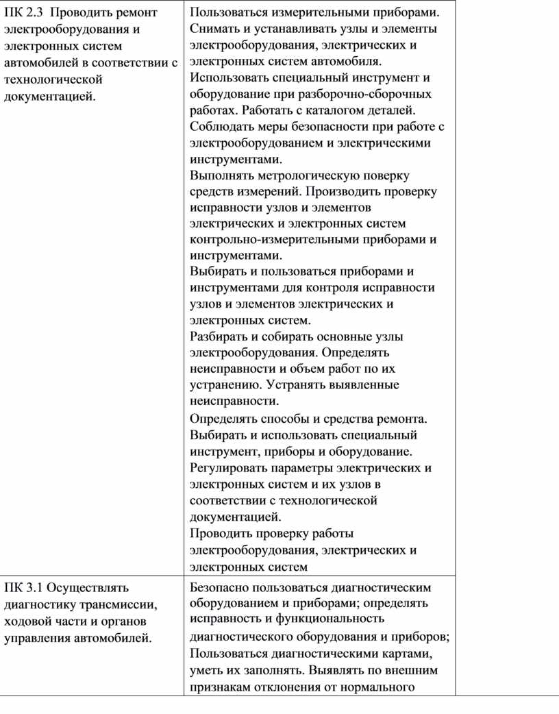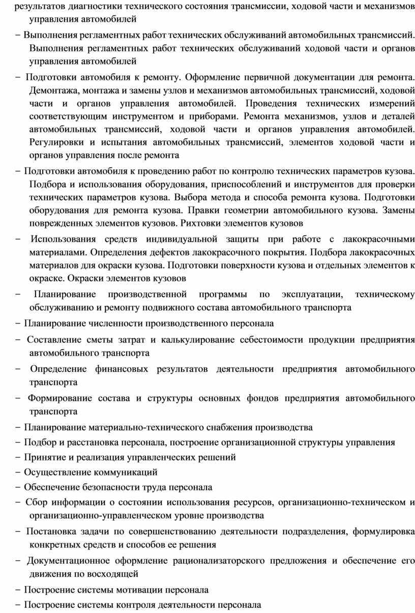 − Регулировки, испытание узлов и элементов электрических и электронных систем Подготовки средств диагностирования трансмиссии, ходовой части и органов управления автомобилей. Диагностики технического состояния автомобильных трансмиссий по внешним признакам. Проведения инструментальной диагностики технического состояния автомобильных трансмиссий Диагностики технического состояния ходовой части и органов управления автомобилей по внешним признакам. Проведения инструментальной диагностики технического состояния ходовой части и органов управления автомобилей. Оценки результатов диагностики технического состояния трансмиссии, ходовой части и механизмов управления автомобилей