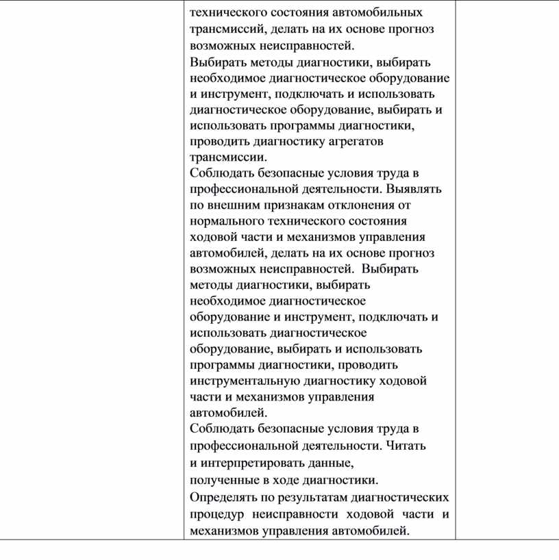 технического состояния автомобильных трансмиссий, делать на их основе прогноз возможных неисправностей. Выбирать методы диагностики, выбирать необходимое диагностическое оборудование и инструмент, подключать и использовать диагностическое оборудование, выбирать и использовать программы диагностики, проводить диагностику агрегатов трансмиссии. Соблюдать безопасные условия труда в профессиональной деятельности. Выявлять по внешним признакам отклонения от нормального технического состояния ходовой части и механизмов управления автомобилей, делать на их основе прогноз возможных неисправностей. Выбирать методы диагностики, выбирать необходимое диагностическое оборудование и инструмент, подключать и использовать диагностическое оборудование, выбирать и использовать программы диагностики, проводить инструментальную диагностику ходовой части и механизмов управления автомобилей. Соблюдать безопасные условия труда в профессиональной деятельности. Читать и интерпретировать данные, полученные в ходе диагностики. Определять по результатам диагностических процедур неисправности ходовой части и механизмов управления автомобилей. |