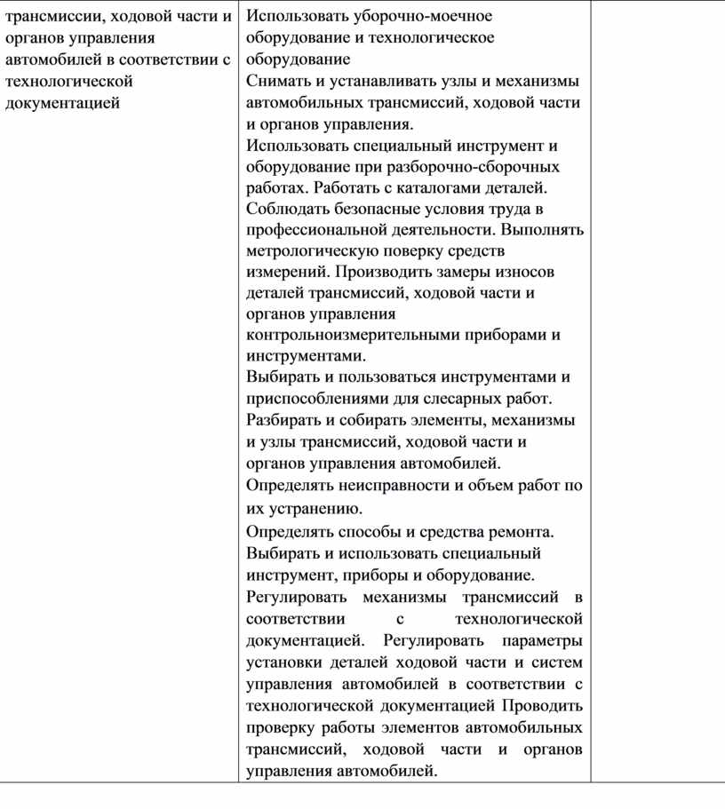 Использовать уборочно-моечное оборудование и технологическое оборудование Снимать и устанавливать узлы и механизмы автомобильных трансмиссий, ходовой части и органов управления. Использовать специальный инструмент и оборудование при разборочно-сборочных работах. Работать с каталогами деталей. Соблюдать безопасные условия труда в профессиональной деятельности. Выполнять метрологическую поверку средств измерений. Производить замеры износов деталей трансмиссий, ходовой части и органов управления контрольноизмерительными приборами и инструментами. Выбирать и пользоваться инструментами и приспособлениями для слесарных работ. Разбирать и собирать элементы, механизмы и узлы трансмиссий, ходовой части и органов управления автомобилей. Определять неисправности и объем работ по их устранению. Определять способы и средства ремонта. Выбирать и использовать специальный инструмент, приборы и оборудование. Регулировать механизмы трансмиссий в соответствии с технологической документацией. Регулировать параметры установки деталей ходовой части и систем управления автомобилей в соответствии с технологической документацией Проводить проверку работы элементов автомобильных трансмиссий, ходовой части и органов управления автомобилей. |