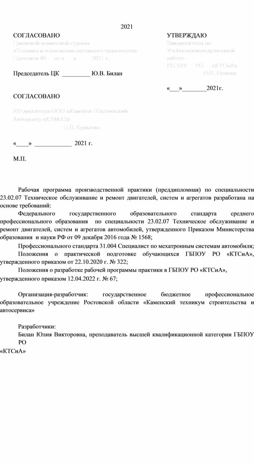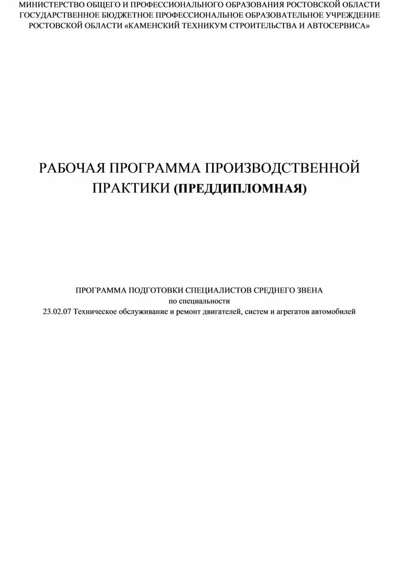 Рабочая программа производственной практики (преддипломная) по специальности 23.02.07 Техническое обслуживание и ремонт двигателей, систем и агрегатов разработана на основе требований: