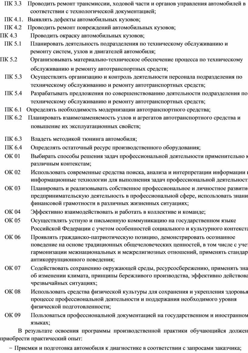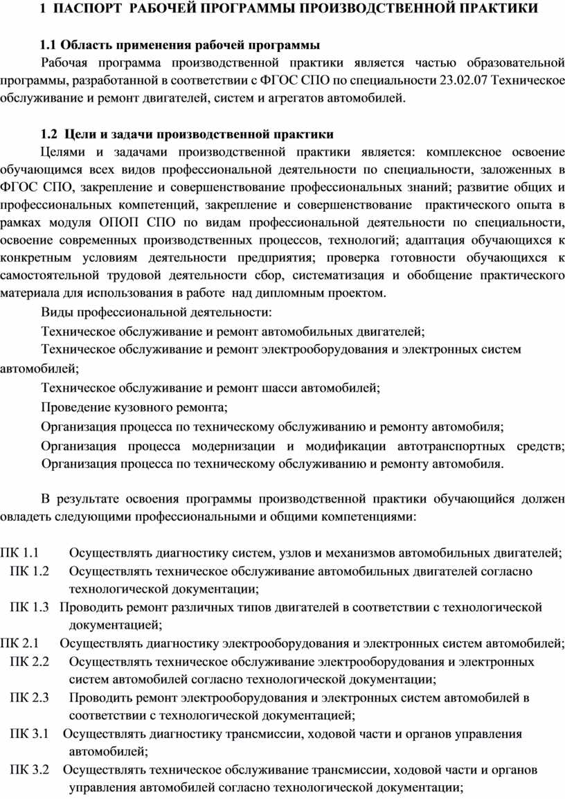 Рабочая программа производственной практики является частью образовательной программы, разработанной в соответствии с ФГОС СПО по специальности 23.02.07 Техническое обслуживание и ремонт двигателей, систем и агрегатов автомобилей.