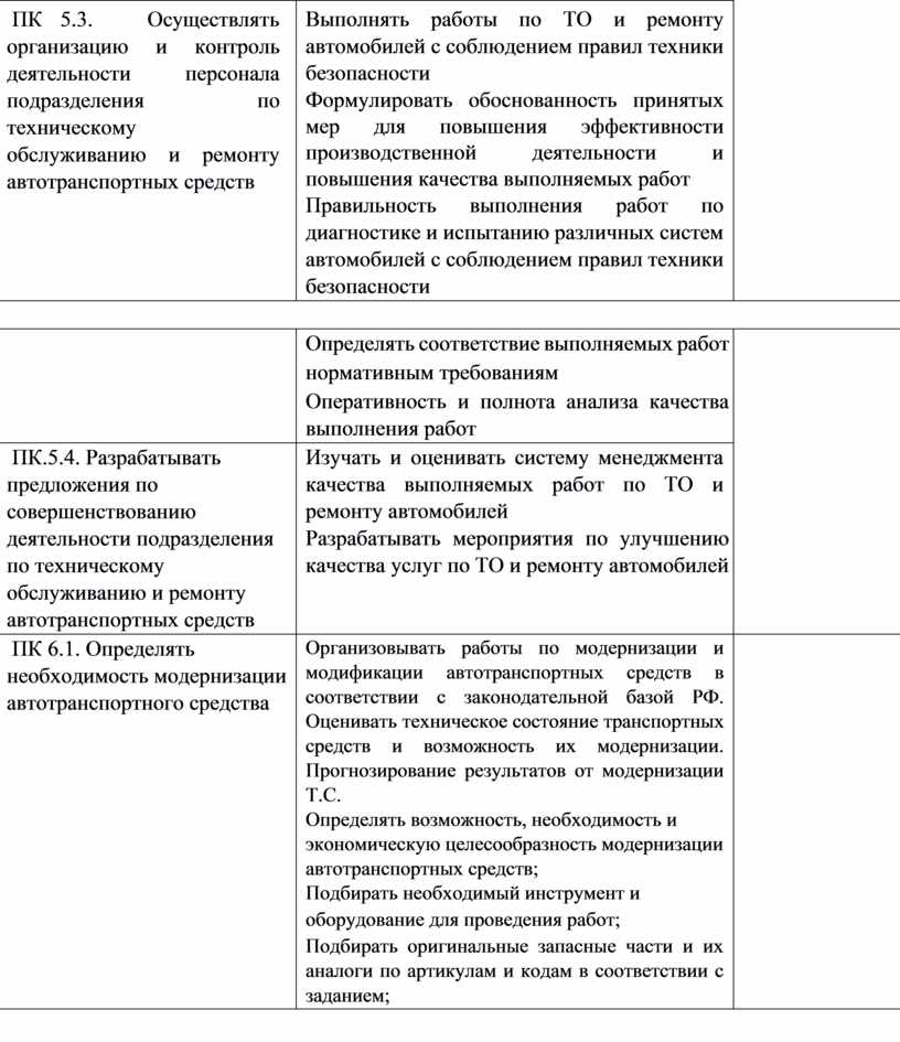 обслуживанию и ремонту автотранспортных средств; ПК 5.3 Осуществлять организацию и контроль деятельности персонала подразделения по техническому обслуживанию и ремонту автотранспортных средств; ПК 5.4 Разрабатывать предложения по совершенствованию деятельности подразделения по техническому обслуживанию и ремонту автотранспортных средств; ПК 6.1 Определять необходимость модернизации автотранспортного средства; ПК 6.2 Планировать взаимозаменяемость узлов и агрегатов автотранспортного средства и |