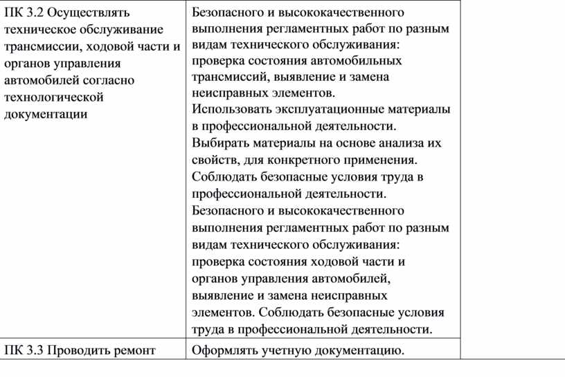 ПК 3.2 Осуществлять техническое обслуживание трансмиссии, ходовой части и органов управления автомобилей согласно технологической документации |