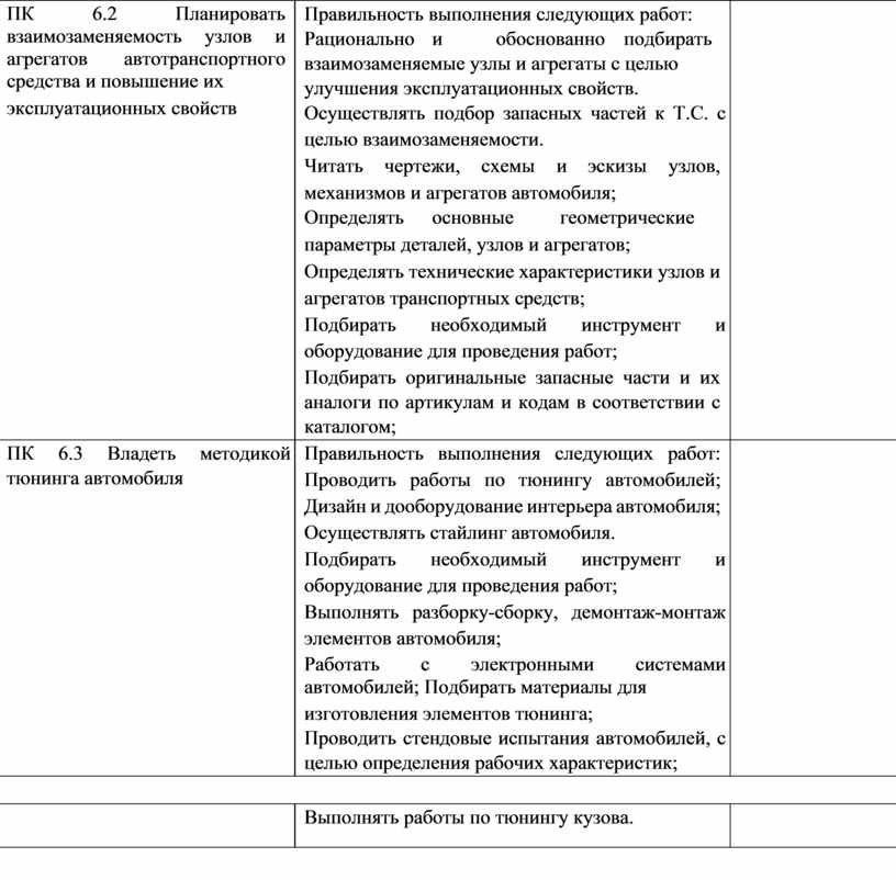 Правильность выполнения следующих работ: Проводить работы по тюнингу автомобилей; Дизайн и дооборудование интерьера автомобиля; Осуществлять стайлинг автомобиля. Подбирать необходимый инструмент и оборудование для проведения работ; Выполнять разборку-сборку, демонтаж-монтаж элементов автомобиля; Работать с электронными системами автомобилей; Подбирать материалы для изготовления элементов тюнинга; Проводить стендовые испытания автомобилей, с целью определения рабочих характеристик; |