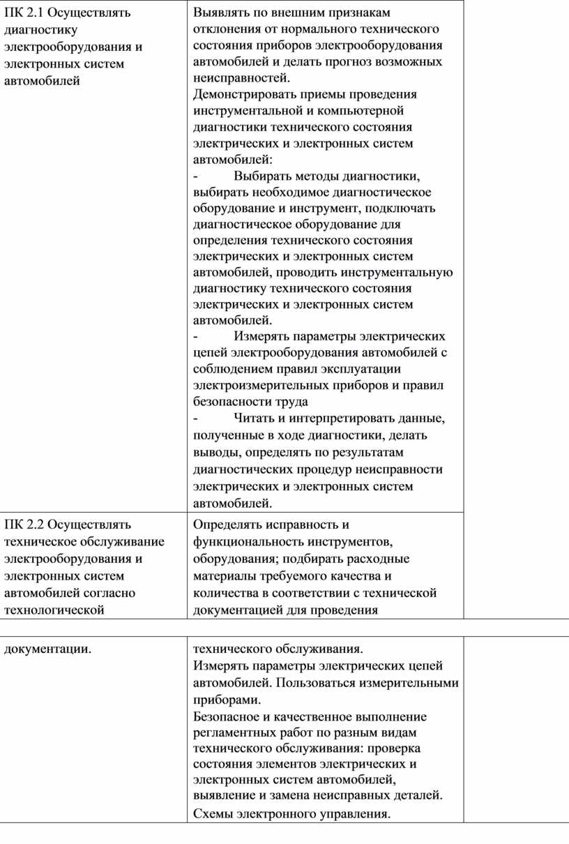 ПК 2.2 Осуществлять техническое обслуживание электрооборудования и электронных систем автомобилей согласно технологической |