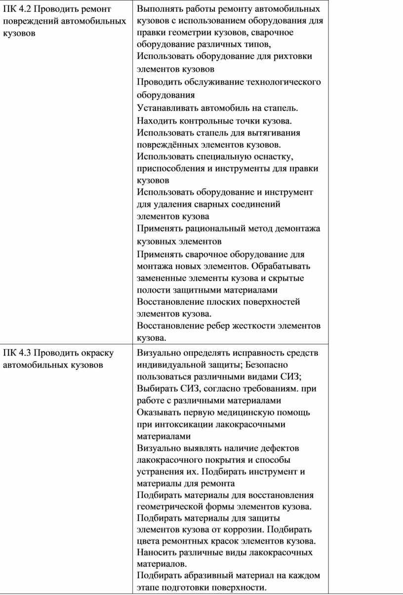 ПК 4.2 Проводить ремонт повреждений автомобильных кузовов;