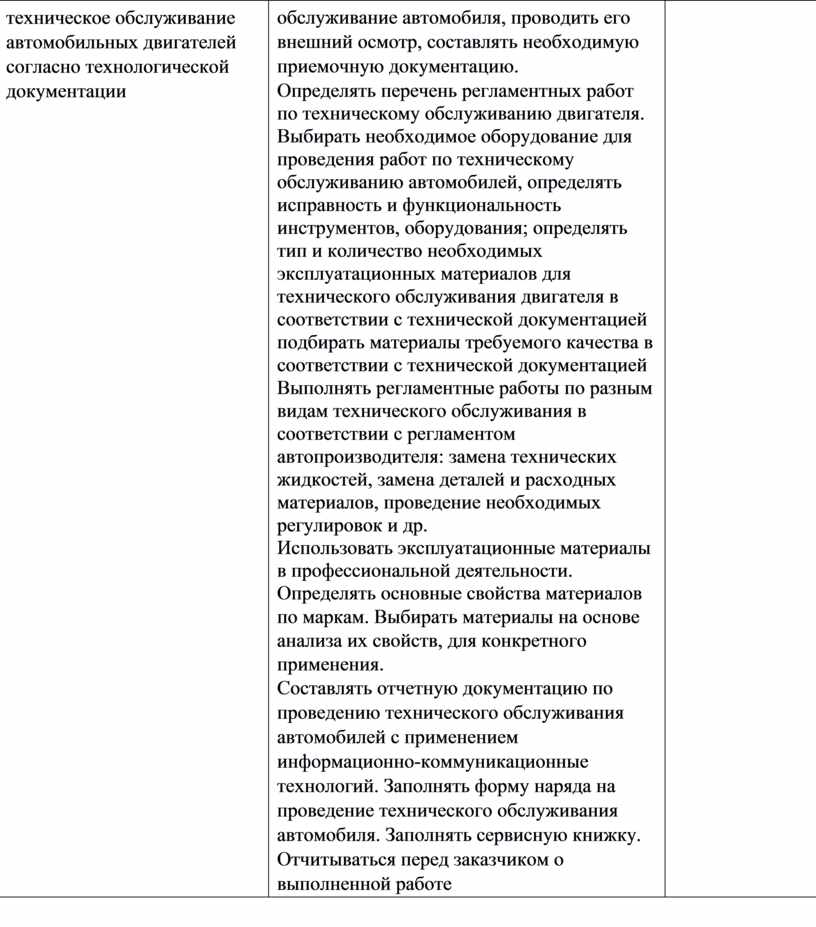 обслуживание автомобиля, проводить его внешний осмотр, составлять необходимую приемочную документацию. Определять перечень регламентных работ по техническому обслуживанию двигателя. Выбирать необходимое оборудование для проведения работ по техническому обслуживанию автомобилей, определять исправность и функциональность инструментов, оборудования; определять тип и количество необходимых эксплуатационных материалов для технического обслуживания двигателя в соответствии с технической документацией подбирать материалы требуемого качества в соответствии с технической документацией Выполнять регламентные работы по разным видам технического обслуживания в соответствии с регламентом автопроизводителя: замена технических жидкостей, замена деталей и расходных материалов, проведение необходимых регулировок и др. Использовать эксплуатационные материалы в профессиональной деятельности. Определять основные свойства материалов по маркам. Выбирать материалы на основе анализа их свойств, для конкретного применения. Составлять отчетную документацию по проведению технического обслуживания автомобилей с применением информационно-коммуникационные технологий. Заполнять форму наряда на проведение технического обслуживания автомобиля. Заполнять сервисную книжку. Отчитываться перед заказчиком о выполненной работе |