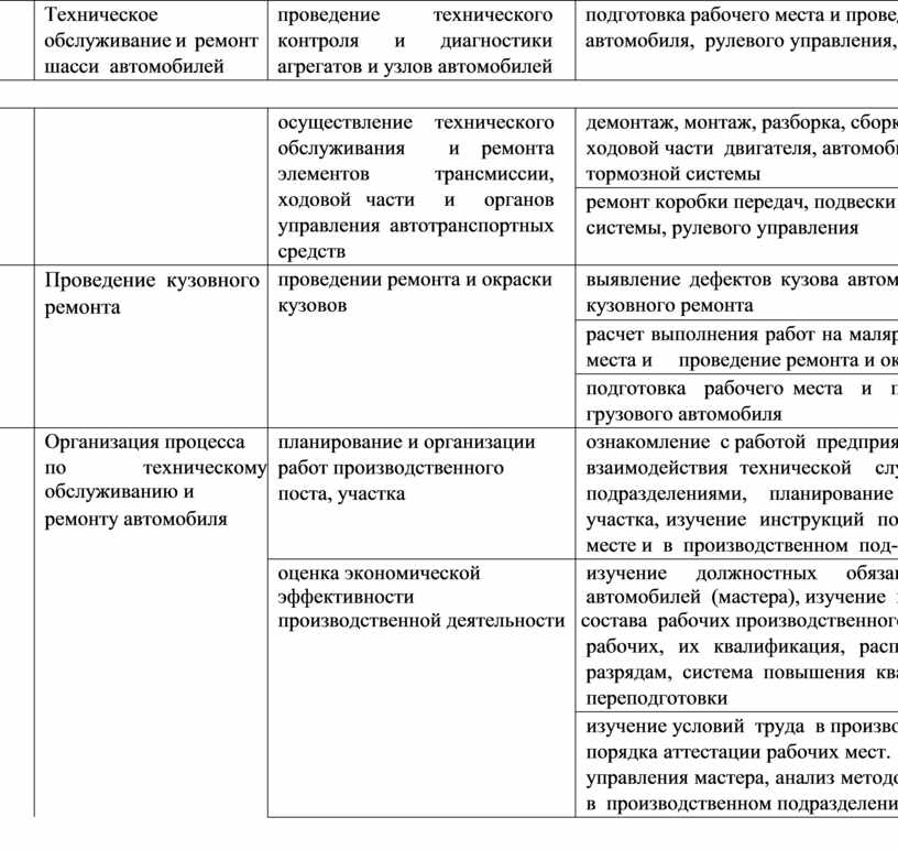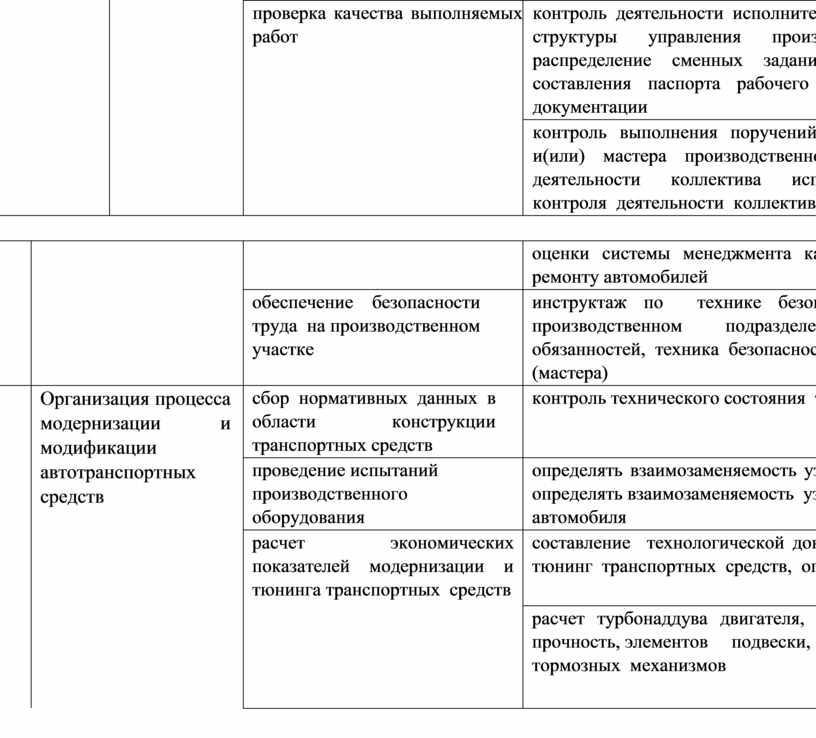 Организация процесса модернизации и модификации автотранспортных средств; Организация процесса по техническому обслуживанию и ремонту автомобиля.