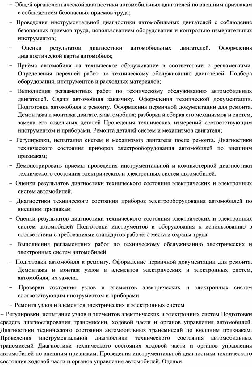− Проведения инструментальной диагностики автомобильных двигателей с соблюдение безопасных приемов труда, использованием оборудования и контрольно-измерительных инструментов;