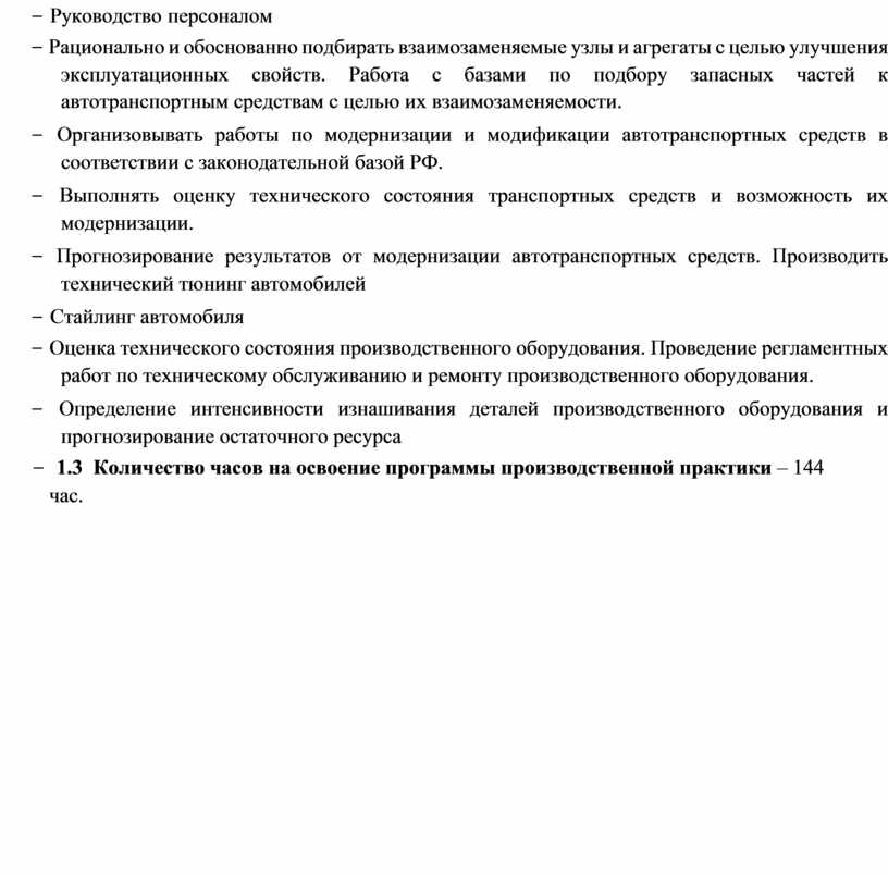 Организовывать работы по модернизации и модификации автотранспортных средств в соответствии с законодательной базой РФ. Оценивать техническое состояние транспортных средств и возможность их модернизации. Прогнозирование результатов от модернизации Т.С. Определять возможность, необходимость и экономическую целесообразность модернизации автотранспортных средств; Подбирать необходимый инструмент и оборудование для проведения работ; Подбирать оригинальные запасные части и их аналоги по артикулам и кодам в соответствии с заданием; |