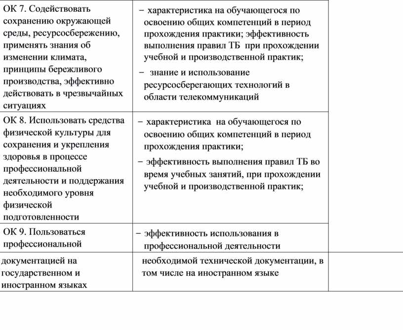 − характеристика на обучающегося по освоению общих компетенций в период прохождения практики; эффективность выполнения правил ТБ при прохождении учебной и производственной практик; − знание и использование ресурсосберегающих технологий в области телекоммуникаций |