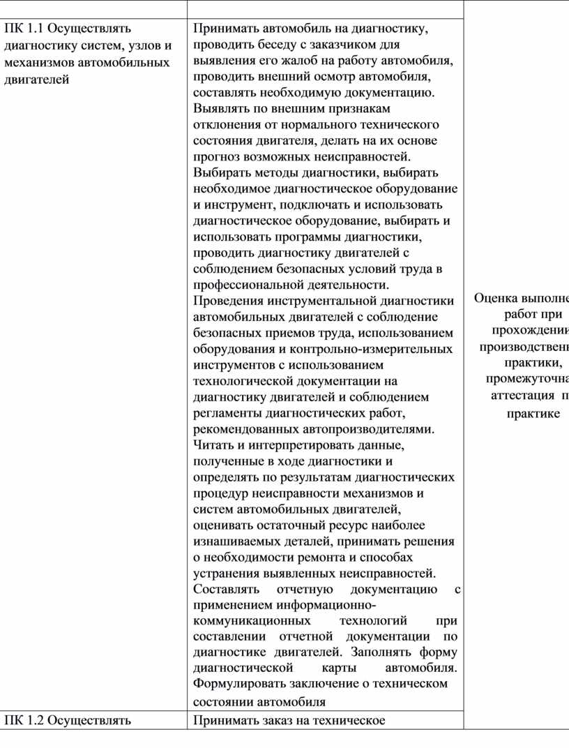 − Выполнения регламентных работ по техническому обслуживанию автомобильных двигателей. Сдачи автомобиля заказчику. Оформления технической документации. Подготовки автомобиля к ремонту. Оформления первичной документации для ремонта. Демонтажа и монтажа двигателя автомобиля; разборка и сборка его механизмов и систем, замена его отдельных деталей Проведения технических измерений соответствующим инструментом и приборами. Ремонта деталей систем и механизмов двигателя;