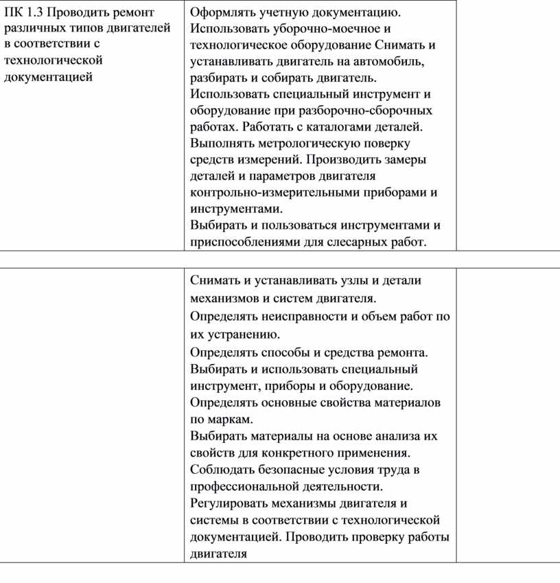 ПК 1.3 Проводить ремонт различных типов двигателей в соответствии с технологической документацией |