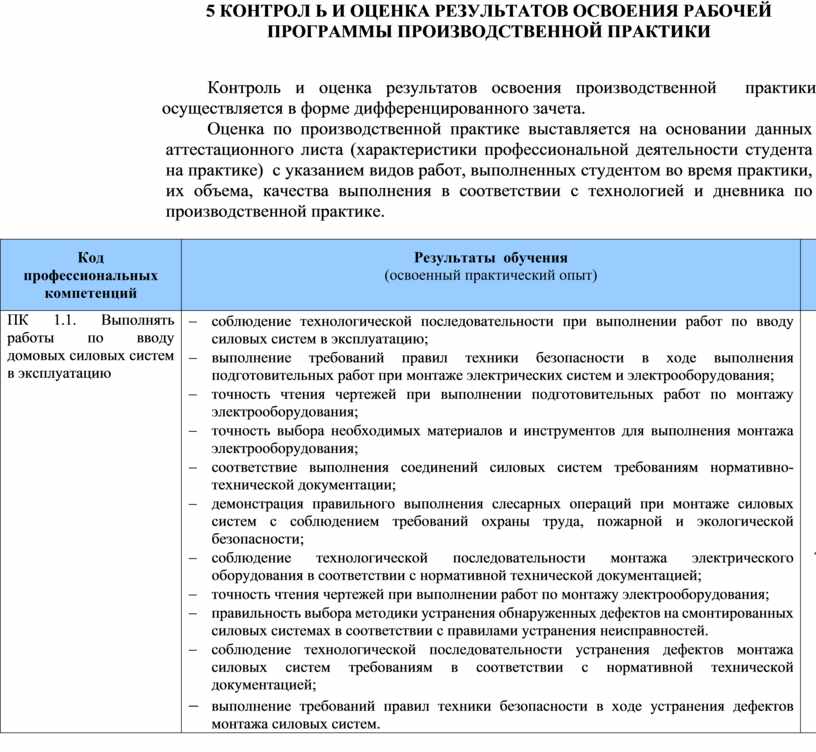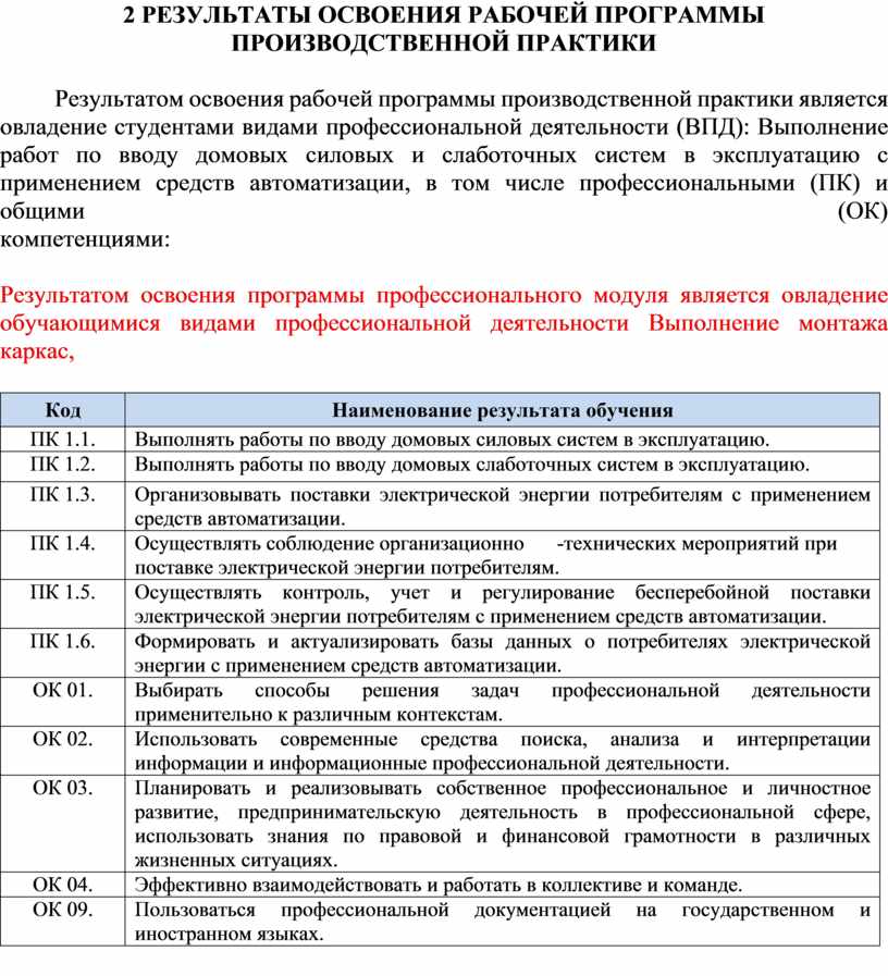 Результатом освоения рабочей программы производственной практики является овладение студентами видами профессиональной деятельности (ВПД): Выполнение работ по вводу домовых силовых и слаботочных систем в эксплуатацию с применением средств автоматизации, в том числе профессиональными (ПК) и общими (ОК) компетенциями: Результатом освоения программы профессионального модуля является овладение обучающимися видами профессиональной деятельности Выполнение монтажа каркас,
