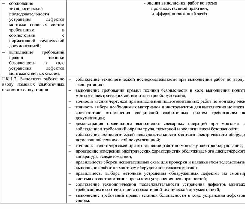- соблюдение технологической последовательности при выполнении работ по вводу слаботочных систем в эксплуатацию; - выполнение требований правил техники безопасности в ходе выполнения подготовительных работ при монтаже электрических систем и электрооборудования; - точность чтения чертежей при выполнении подготовительных работ по монтажу электрооборудования; - точность выбора необходимых материалов и инструментов для выполнения монтажа электрооборудования; - соответствие выполнения соединений слаботочных систем требованиям нормативно-технической документации; - демонстрация правильного выполнения слесарных операций при монтаже слаботочных систем с соблюдением требований охраны труда, пожарной и экологической безопасности; - соблюдение технологической последовательности монтажа электрического оборудования в соответствии с нормативной технической документацией; - точность чтения чертежей при выполнении работ по монтажу электрооборудования; - проведение измерений электрических характеристик обслуживаемого диспетчерского оборудования и аппаратуры телеавтоматики; - правильность сборки испытательных схем для проверки и наладки схем телеавтоматики; - выполнение работ по монтажу оборудования телеавтоматики; - правильность выбора методики устранения обнаруженных дефектов на смонтированных слаботочных системах в соответствии с правилами устранения неисправностей; - соблюдение технологической последовательности устранения дефектов монтажа слаботочных систем требованиям в соответствии с нормативной технической документацией; - выполнение требований правил техники безопасности в ходе устранения дефектов монтажа слаботочных систем. |