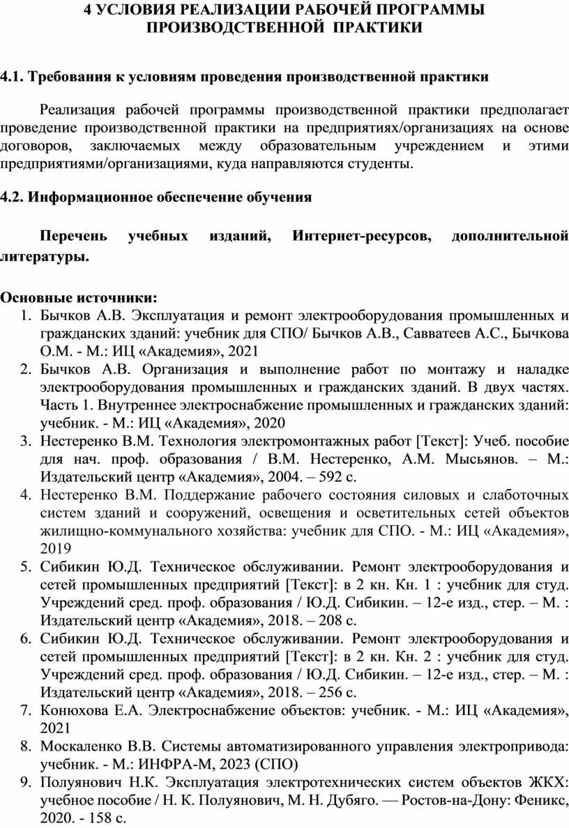 1. Бычков А.В. Эксплуатация и ремонт электрооборудования промышленных и гражданских зданий: учебник для СПО/ Бычков А.В., Савватеев А.С., Бычкова О.М. - М.: ИЦ «Академия», 2021