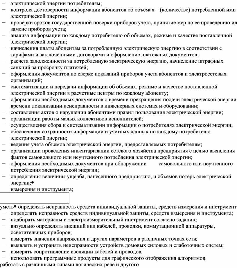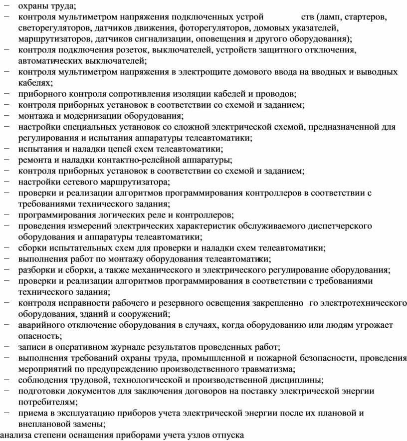 − планирования выполнения работ по вводу домовых силовых систем и слаботочных систем в эксплуатацию на основании задания и на основе должностной инструкции; − выбора электроизмерительных инструментов в соответствии с полученным заданием; − выбора средств индивидуальной защиты; − подготовки рабочего места на соответствие требованиям охраны труда; − контроля мультиметром напряжения подключенных устройств (ламп, стартеров, светорегуляторов, датчиков движения, фоторегуляторов, домовых указателей, маршрутизаторов, датчиков сигнализации, оповещения и другого оборудования); − контроля подключения розеток, выключателей, устройств защитного отключения, автоматических выключателей; − контроля мультиметром напряжения в электрощите домового ввода на вводных и выводных кабелях; − приборного контроля сопротивления изоляции кабелей и проводов; − контроля приборных установок в соответствии со схемой и заданием; − монтажа и модернизации оборудования; − настройки специальных установок со сложной электрической схемой, предназначенной для регулирования и испытания аппаратуры телеавтоматики; − испытания и наладки цепей схем телеавтоматики; − ремонта и наладки контактно-релейной аппаратуры; − контроля приборных установок в соответствии со схемой и заданием; − настройки сетевого маршрутизатора; − проверки и реализации алгоритмов программирования контроллеров в соответствии с требованиями технического задания; − программирования логических реле и контроллеров; − проведения измерений электрических характеристик обслуживаемого диспетчерского оборудования и аппаратуры телеавтоматики; − сборки испытательных схем для проверки и наладки схем телеавтоматики; − выполнения работ по монтажу оборудования телеавтоматики; − разборки и сборки, а также механического и электрического регулирование оборудования; − проверки и реализации алгоритмов программирования в соответствии с требованиями технического задания; − контроля исправности рабочего и резервного освещения закрепленного электротехнического оборудования, зданий и сооружений; − аварийного отключение оборудования в случаях, когда оборудованию или людям угрожает опасность; − записи в оперативном журнале результатов проведенных работ; − выполнения требований охраны труда, промышленной и пожарной безопасности, проведения мероприятий по предупреждению производственного травматизма; − соблюдения трудовой, технологической и производственной дисциплины; − подготовки документов для заключения договоров на поставку электрической энергии потребителям; − приема в эксплуатацию приборов учета электрической энергии после их плановой и внеплановой замены; − анализа степени оснащения приборами учета узлов отпуска электрической энергии потребителям; − контроля достоверности информации абонентов об объемах (количестве) потребленной ими электрической энергии; − проверки сроков государственной поверки приборов учета, принятие мер по ее проведению или замене приборов учета; − анализа информации по каждому потребителю об объемах, режиме и качестве поставленной электрической энергии; − начисления платы абонентам за потребленную электрическую энергию в соответствии с тарифами и заключенными договорами и оформление платежных документов; − расчета за