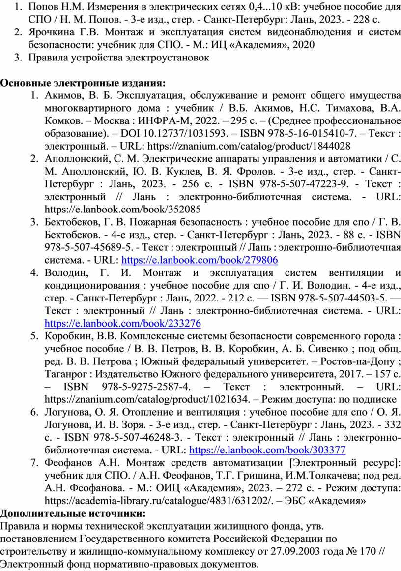 1. Акимов, В. Б. Эксплуатация, обслуживание и ремонт общего имущества многоквартирного дома : учебник / В.Б. Акимов, Н.С. Тимахова, В.А. Комков. – Москва : ИНФРА-М, 2022. – 295 с. – (Среднее профессиональное образование). – DOI 10.12737/1031593. – ISBN 978-5-16-015410-7. – Текст : электронный. – URL: https://znanium.com/catalog/product/1844028