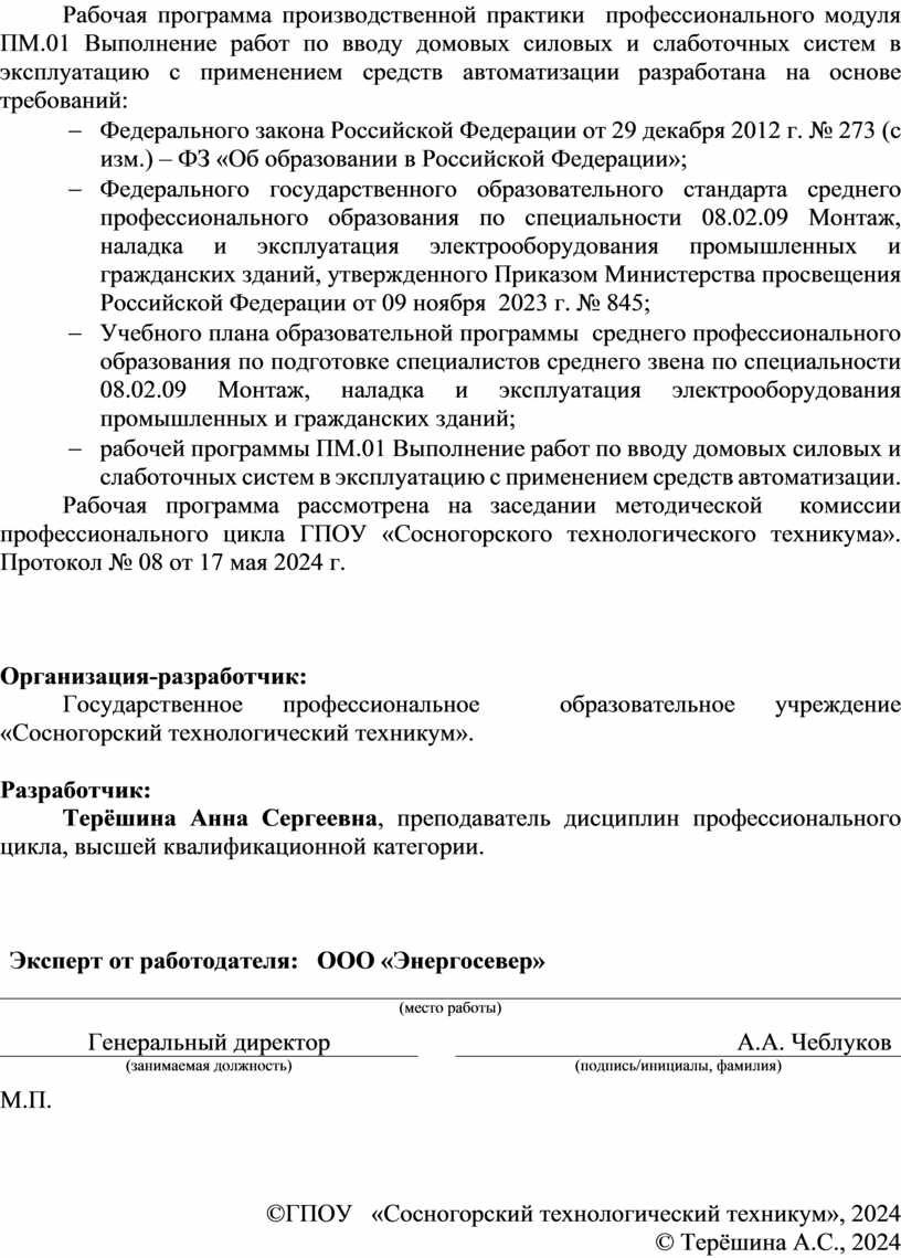 Рабочая программа рассмотрена на заседании методической комиссии профессионального цикла ГПОУ «Сосногорского технологического техникума». Протокол № 08 от 17 мая 2024 г.