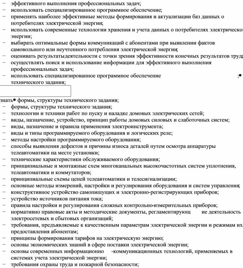 − формы, структуры технического задания; − технологии и техники работ по пуску и наладке домовых электрических сетей; − виды, назначение, устройство, принцип работы домовых силовых и слаботочных систем; − виды, назначение и правила применения электроинструмента; − виды и типы программируемого оборудования и логических реле; − методы настройки программируемого оборудования; − способы выявления дефектов и причины износа деталей путем осмотра аппаратуры телеавтоматики на месте установки; − технические характеристики обслуживаемого оборудования; − принципиальные и монтажные схем многоканальных высокочастотных систем уплотнения, телеавтоматики и коммутаторов; − принципиальные схемы цепей телеавтоматики и телесигнализации; − основные методы измерений, настройки и регулирования оборудования и систем управления; − конструктивное устройство самопишущих и электронно-регистрирующих приборов; − устройство источников питания тока; − правила настройки и регулирования сложных контрольно-измерительных приборов; − нормативно правовые акты и методические документы, регламентирующие деятельность электросетевых и сбытовых организаций; − требования, предъявляемые к качественным параметрам электрической энергии и режимам их предоставления абонентам; − принципы формирования тарифов на электрическую энергию; − основы экономических знаний в сфере поставки электрической энергии; − основы современных информационно-коммуникационных технологий, применяемых в системах учета электрической энергии; − требования охраны труда и пожарной безопасности; − порядок работы с электроизмерительными приборами; − основные технические характеристики систем и приборов учета электрической энергии; − номенклатуру и правила эксплуатации систем и приборов учета электрической энергии. |