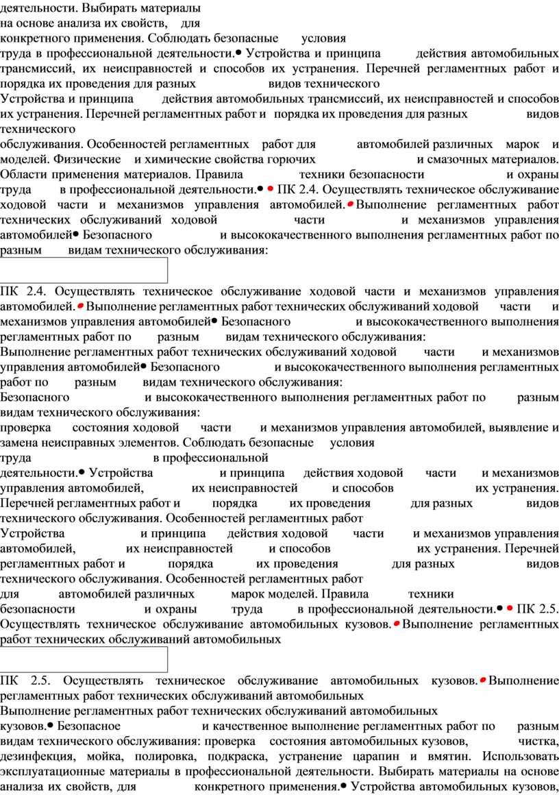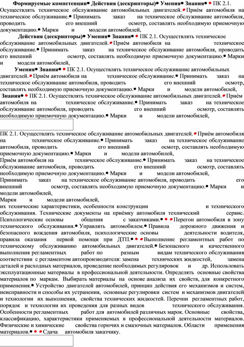 - рабочей программы ПМ.02 Техническое обслуживание автотранспорта согласно требованиям нормативно-технической документации в соответствии с требованиями технологической документации.