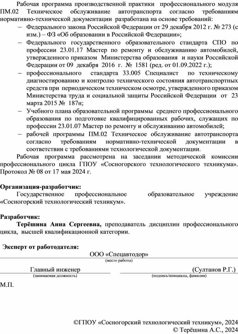 Рабочая программа рассмотрена на заседании методической комиссии профессионального цикла ГПОУ «Сосногорского технологического техникума». Протокол № 08 от 17 мая 2024 г.