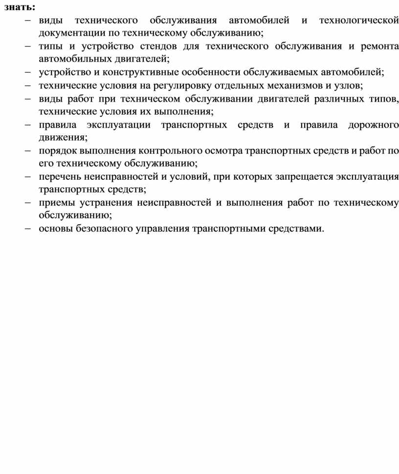 - выбирать и пользоваться инструментами, приспособлениями и стендами для технического обслуживания систем и частей автомобилей;