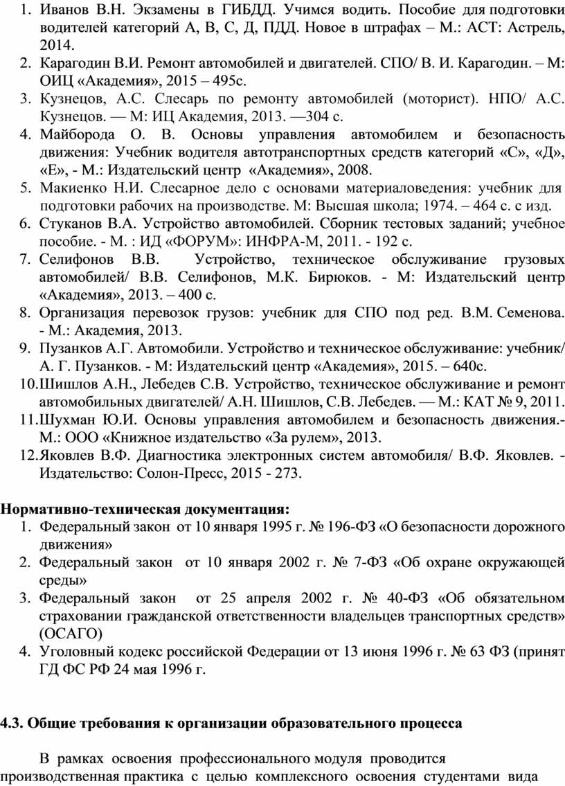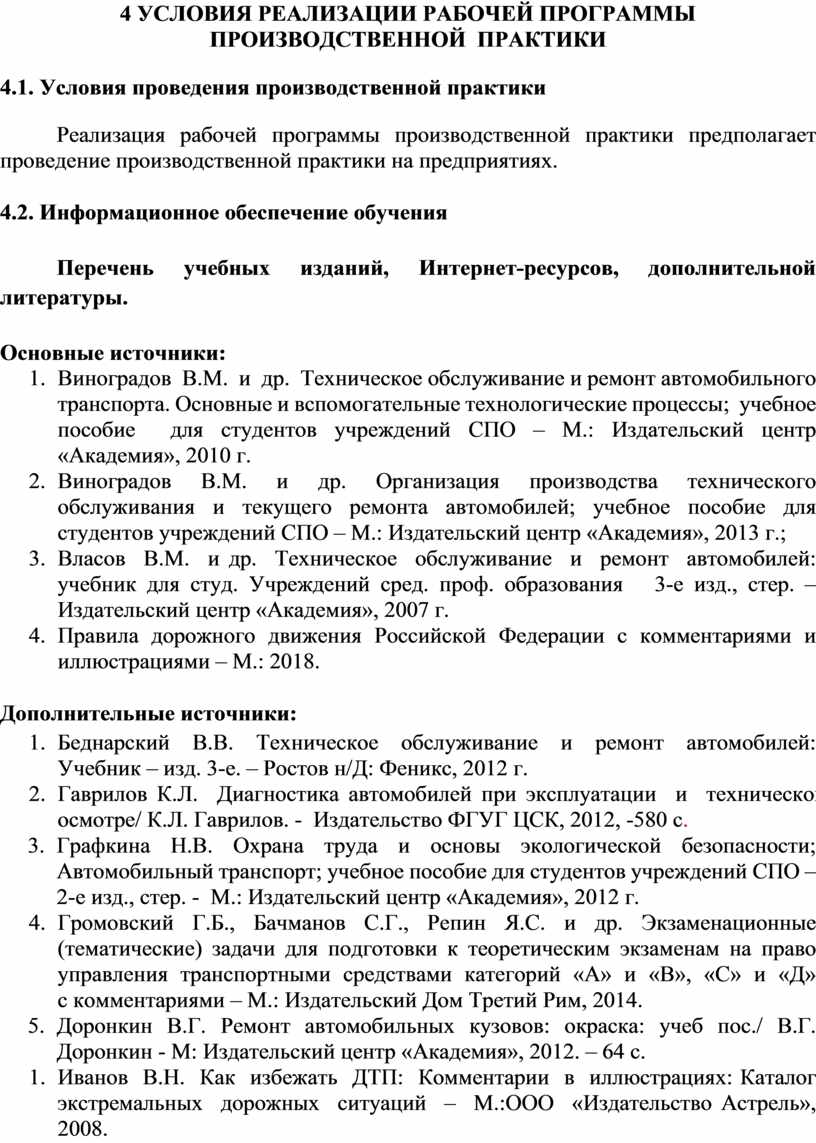 1. Виноградов В.М. и др. Техническое обслуживание и ремонт автомобильного транспорта. Основные и вспомогательные технологические процессы; учебное пособие для студентов учреждений СПО – М.: Издательский центр «Академия», 2010 г.