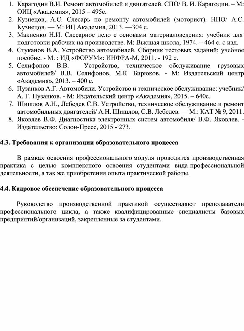 4. Карагодин В.И. Ремонт автомобилей и двигателей. СПО/ В. И. Карагодин. – М: ОИЦ «Академия», 2015 – 495с.