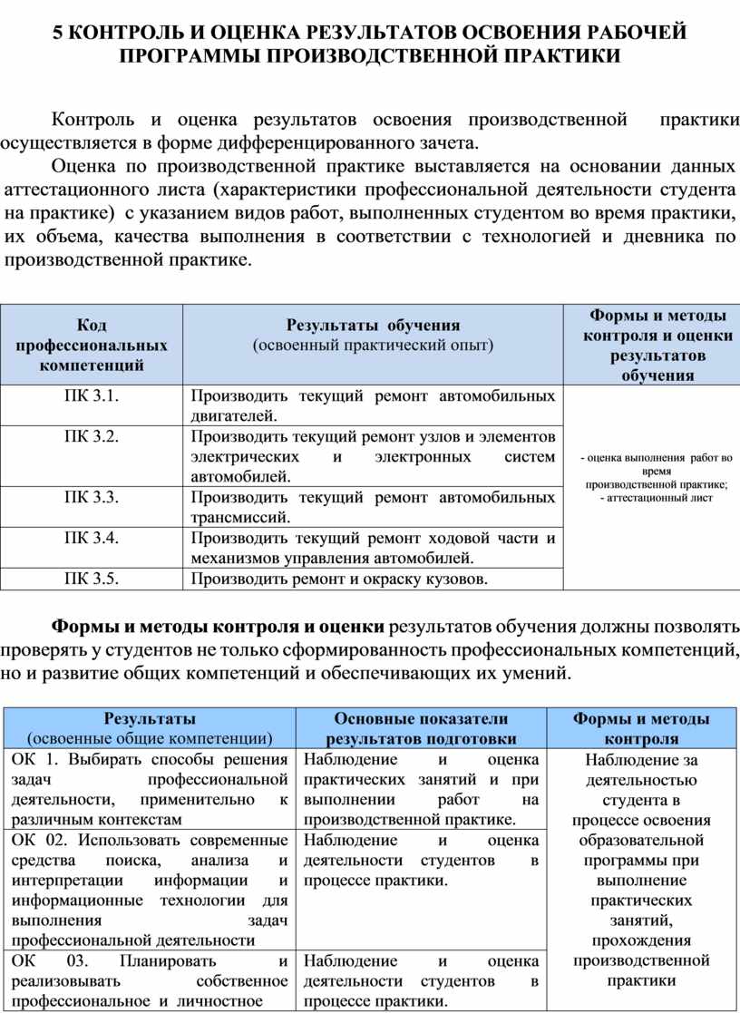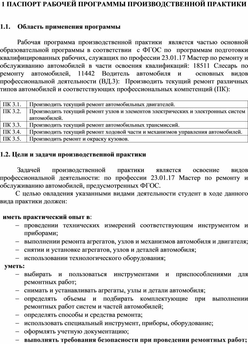 Рабочая программа производственной практики является частью основной образовательной программы в соответствии с ФГОС по программам подготовки квалифицированных рабочих, служащих по профессии 23.01.17 Мастер по ремонту и обслуживанию автомобилей в части освоения квалификаций: 18511 Слесарь по ремонту автомобилей, 11442 Водитель автомобиля и основных видов профессиональной деятельности (ВД.3): Производить текущий ремонт различных типов автомобилей и соответствующих профессиональных компетенций (ПК):