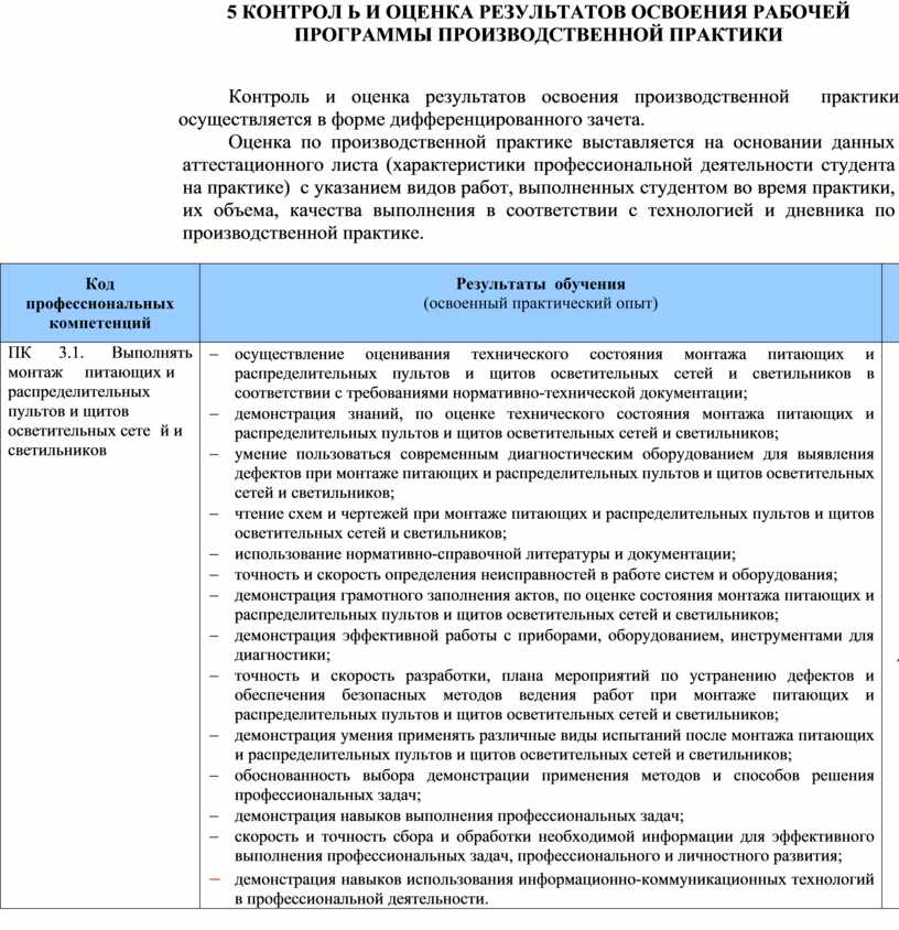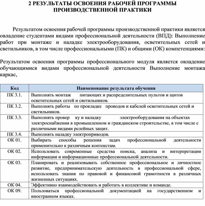 Результатом освоения рабочей программы производственной практики является овладение студентами видами профессиональной деятельности (ВПД): Выполнение работ при монтаже и наладке электрооборудования, осветительных сетей и светильников, в том числе профессиональными (ПК) и общими (ОК) компетенциями: Результатом освоения программы профессионального модуля является овладение обучающимися видами профессиональной деятельности Выполнение монтажа каркас,