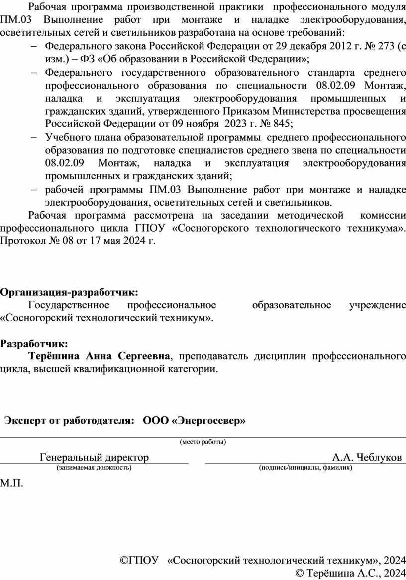 Рабочая программа рассмотрена на заседании методической комиссии профессионального цикла ГПОУ «Сосногорского технологического техникума». Протокол № 08 от 17 мая 2024 г.