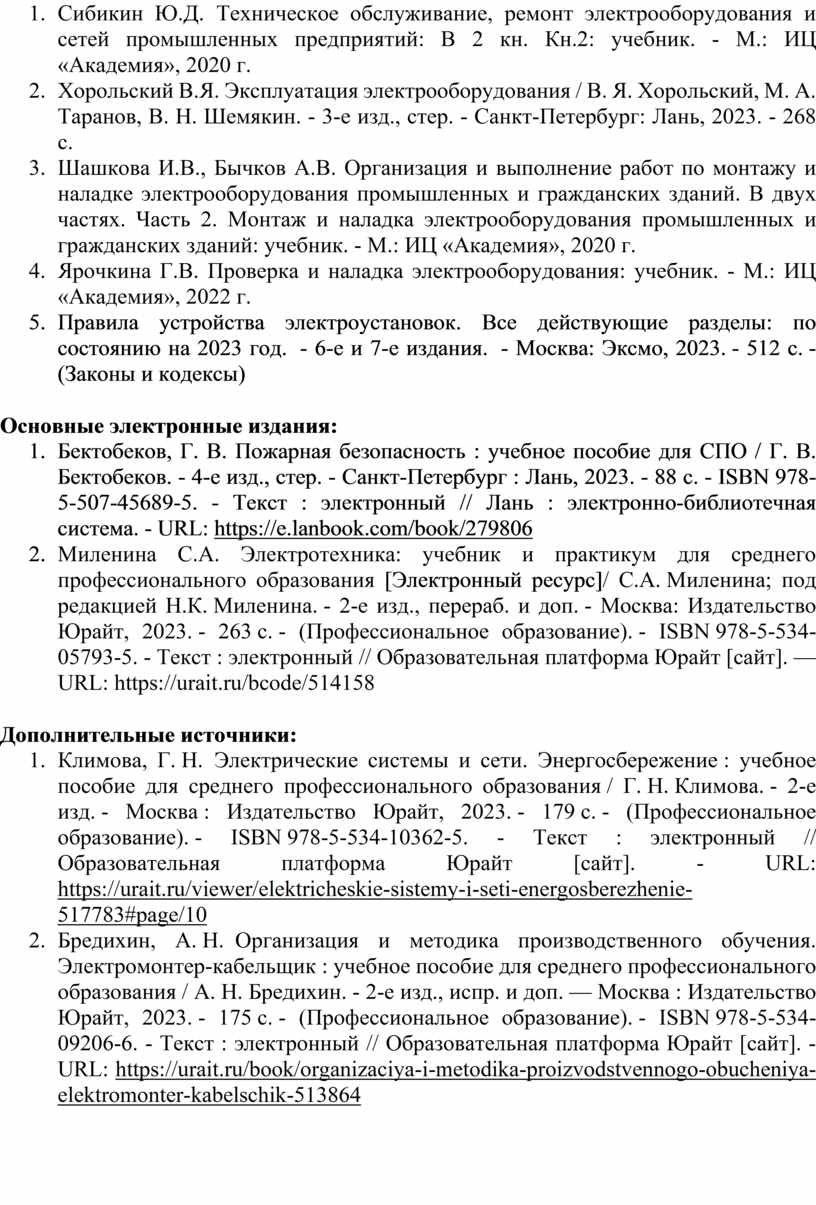 2. Бредихин, А. Н. Организация и методика производственного обучения. Электромонтер-кабельщик : учебное пособие для среднего профессионального образования / А. Н. Бредихин. - 2-е изд., испр. и доп. — Москва : Издательство Юрайт, 2023. - 175 с. - (Профессиональное образование). - ISBN 978-5-534-09206-6. - Текст : электронный // Образовательная платформа Юрайт [сайт]. - URL: https://urait.ru/book/organizaciya-i-metodika-proizvodstvennogo-obucheniya-elektromonter-kabelschik-513864