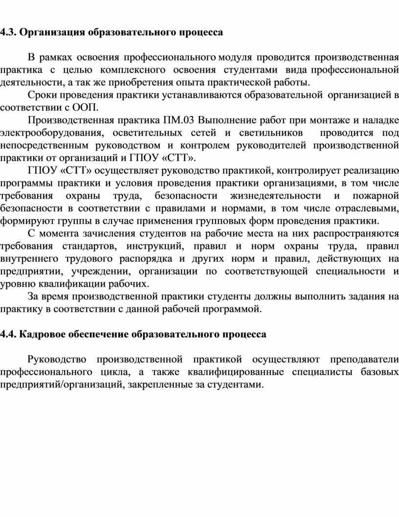 Производственная практика ПМ.03 Выполнение работ при монтаже и наладке электрооборудования, осветительных сетей и светильников проводится под непосредственным руководством и контролем руководителей производственной практики от организаций и ГПОУ «СТТ».