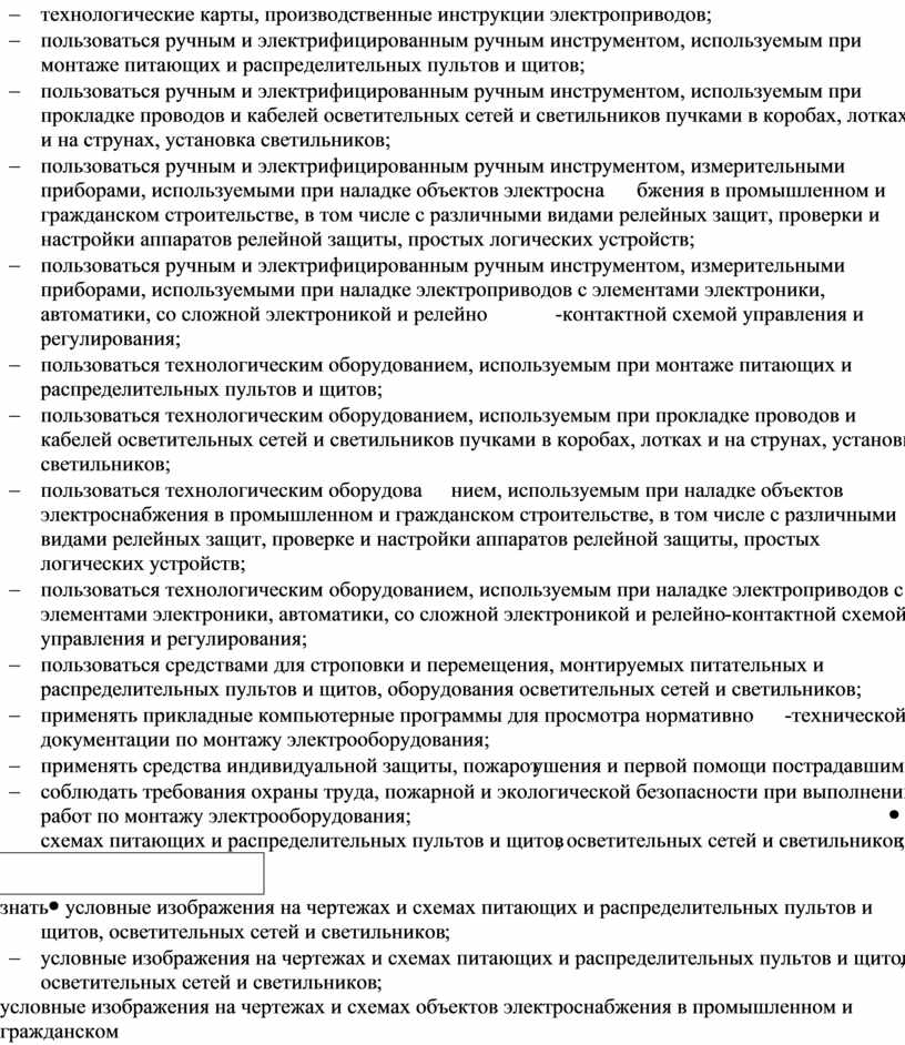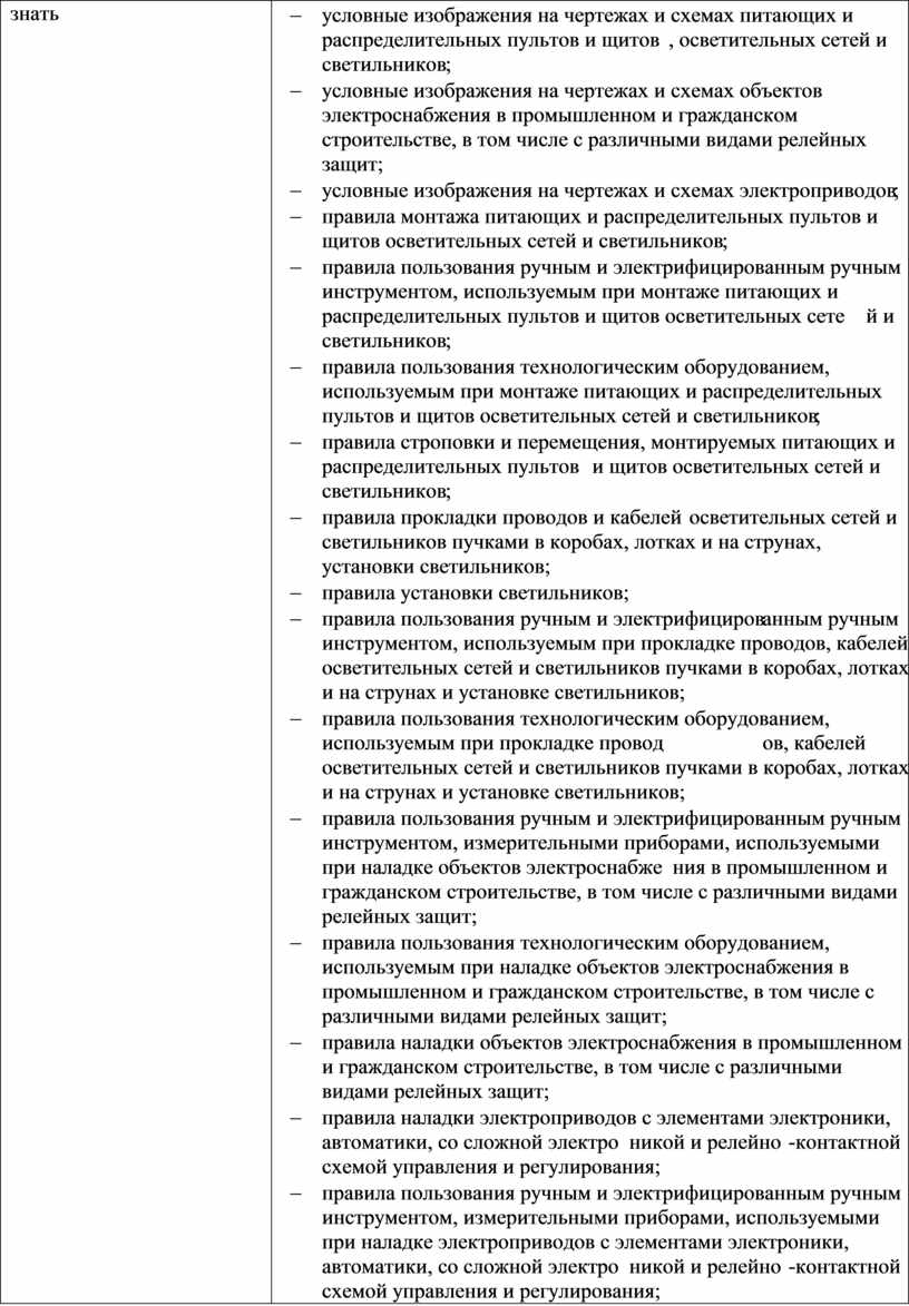 - условные изображения на чертежах и схемах питающих и распределительных пультов и щитов, осветительных сетей и светильников; - условные изображения на чертежах и схемах объектов электроснабжения в промышленном и гражданском строительстве, в том числе с различными видами релейных защит; - условные изображения на чертежах и схемах электроприводов; - правила монтажа питающих и распределительных пультов и щитов осветительных сетей и светильников; - правила пользования ручным и электрифицированным ручным инструментом, используемым при монтаже питающих и распределительных пультов и щитов осветительных сетей и светильников; - правила пользования технологическим оборудованием, используемым при монтаже питающих и распределительных пультов и щитов осветительных сетей и светильников; - правила строповки и перемещения, монтируемых питающих и распределительных пультов и щитов осветительных сетей и светильников; - правила прокладки проводов и кабелей осветительных сетей и светильников пучками в коробах, лотках и на струнах, установки светильников; - правила установки светильников; - правила пользования ручным и электрифицированным ручным инструментом, используемым при прокладке проводов, кабелей осветительных сетей и светильников пучками в коробах, лотках и на струнах и установке светильников; - правила пользования технологическим оборудованием, используемым при прокладке проводов, кабелей осветительных сетей и светильников пучками в коробах, лотках и на струнах и установке светильников; - правила пользования ручным и электрифицированным ручным инструментом, измерительными приборами, используемыми при наладке объектов электроснабжения в промышленном и гражданском строительстве, в том числе с различными видами релейных защит; - правила пользования технологическим оборудованием, используемым при наладке объектов электроснабжения в промышленном и гражданском строительстве, в том числе с различными видами релейных защит; - правила наладки объектов электроснабжения в промышленном и гражданском строительстве, в том числе с различными видами релейных защит; - правила наладки электроприводов с элементами электроники, автоматики, со сложной электроникой и релейно-контактной схемой управления и регулирования; - правила пользования ручным и электрифицированным ручным инструментом, измерительными приборами, используемыми при наладке электроприводов с элементами электроники, автоматики, со сложной электроникой и релейно-контактной схемой управления и регулирования; - правила пользования технологического оборудования, используемого при наладке электроприводов с элементами электроники, автоматики, со сложной электроникой и релейно-контактной схемой управления и регулирования; - правила по охране труда при работе на высоте; - правила по охране труда при эксплуатации электроустановок; - производственные инструкции по монтажу питающих и распределительных пультов и щитов осветительных сетей и светильников; - производственные инструкции по прокладке проводов и кабелей осветительных сетей и светильников пучками в коробах, лотках и на струнах, установке светильников; - производственные инструкции по наладке объектов электроснабжения в промышленном и гражданском строительстве, в том числе с различными видами реле