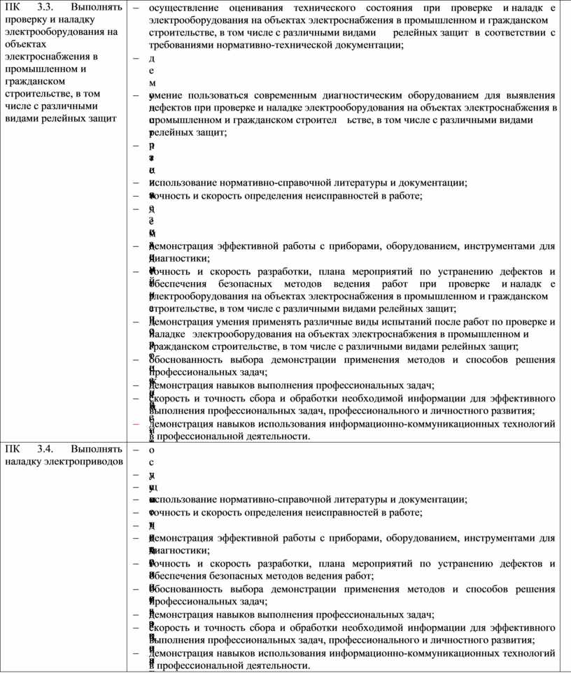 - осуществление оценивания технического состояния при проверке и наладке электрооборудования на объектах электроснабжения в промышленном и гражданском строительстве, в том числе с различными видами релейных защит в соответствии с требованиями нормативно-технической документации; - демонстрация знаний, по оценке технического состояния выполненных работ по проверке и наладке электрооборудования на объектах электроснабжения в промышленном и гражданском строительстве, в том числе с различными видами релейных защит; - умение пользоваться современным диагностическим оборудованием для выявления дефектов при проверке и наладке электрооборудования на объектах электроснабжения в промышленном и гражданском строительстве, в том числе с различными видами релейных защит; - чтение схем и чертежей при выполнении работ по проверке и наладке электрооборудования на объектах электроснабжения в промышленном и гражданском строительстве, в том числе с различными видами релейных защит; - использование нормативно-справочной литературы и документации; - точность и скорость определения неисправностей в работе; - демонстрация грамотного заполнения актов при выполнении работ по проверке и наладке электрооборудования на объектах электроснабжения в промышленном и гражданском строительстве, в том числе с различными видами релейных защит; - демонстрация эффективной работы с приборами, оборудованием, инструментами для диагностики; - точность и скорость разработки, плана мероприятий по устранению дефектов и обеспечения безопасных методов ведения работ при проверке и наладке электрооборудования на объектах электроснабжения в промышленном и гражданском строительстве, в том числе с различными видами релейных защит; - демонстрация умения применять различные виды испытаний после работ по проверке и наладке электрооборудования на объектах электроснабжения в промышленном и гражданском строительстве, в том числе с различными видами релейных защит; - обоснованность выбора демонстрации применения методов и способов решения профессиональных задач; - демонстрация навыков выполнения профессиональных задач; - скорость и точность сбора и обработки необходимой информации для эффективного выполнения профессиональных задач, профессионального и личностного развития; - демонстрация навыков использования информационно-коммуникационных технологий в профессиональной деятельности. |
