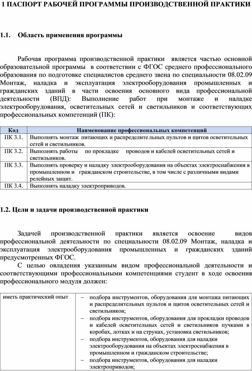 Рабочая программа производственной практики является частью основной образовательной программы в соответствии с ФГОС среднего профессионального образования по подготовке специалистов среднего звена по специальности 08.02.09 Монтаж, наладка и эксплуатация электрооборудования промышленных и гражданских зданий в части освоения основного вида профессиональной деятельности (ВПД): Выполнение работ при монтаже и наладке электрооборудования, осветительных сетей и светильников и соответствующих профессиональных компетенций (ПК):