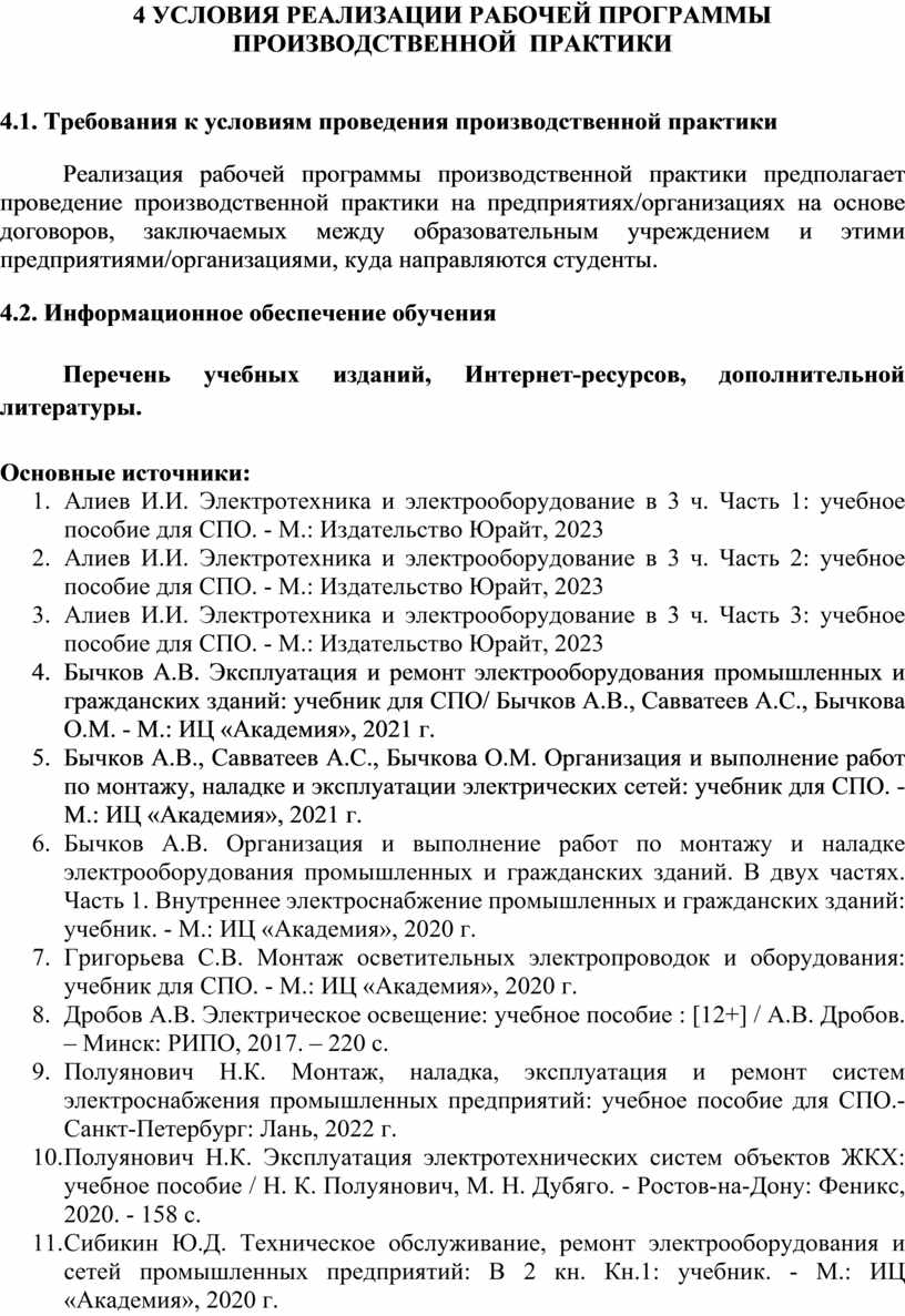 4. Бычков А.В. Эксплуатация и ремонт электрооборудования промышленных и гражданских зданий: учебник для СПО/ Бычков А.В., Савватеев А.С., Бычкова О.М. - М.: ИЦ «Академия», 2021 г.