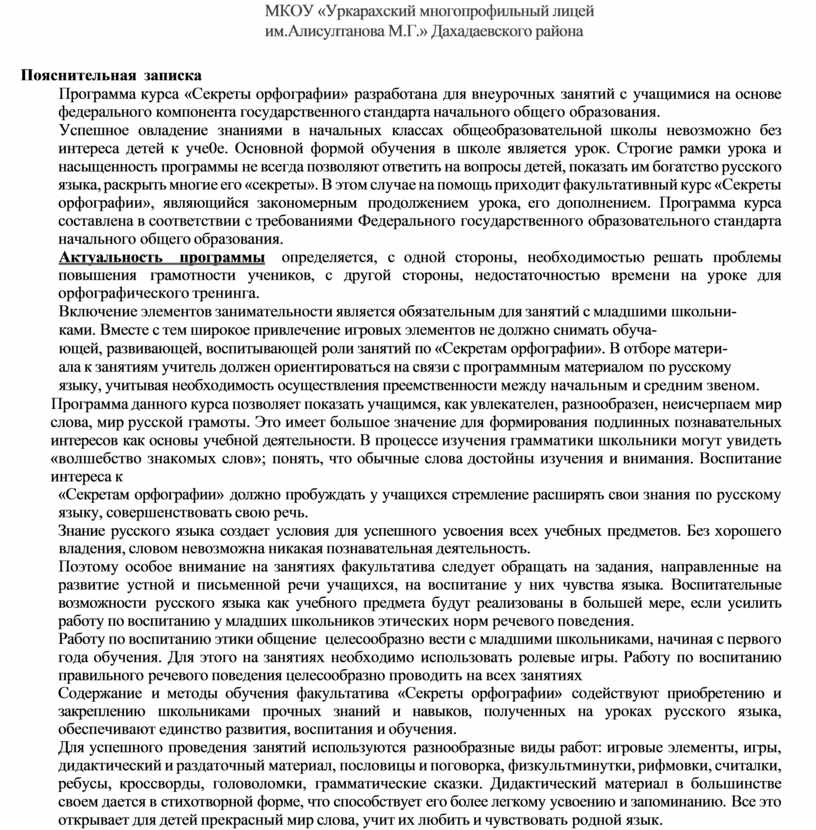 Успешное овладение знаниями в начальных классах общеобразовательной школы невозможно без интереса детей к уче0е. Основной формой обучения в школе является урок. Строгие рамки урока и насыщенность программы не всегда позволяют ответить на вопросы детей, показать им богатство русского языка, раскрыть многие его «секреты». В этом случае на помощь приходит факультативный курс «Секреты орфографии», являющийся закономерным продолжением урока, его дополнением. Программа курса составлена в соответствии с требованиями Федерального государственного образовательного стандарта начального общего образования.