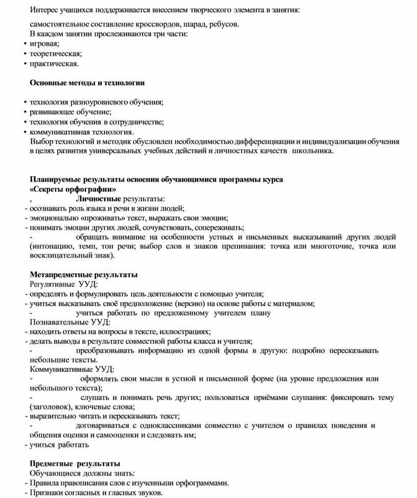 Содержание и методы обучения факультатива «Секреты орфографии» содействуют приобретению и закреплению школьниками прочных знаний и навыков, полученных на уроках русского языка, обеспечивают единство развития, воспитания и обучения.