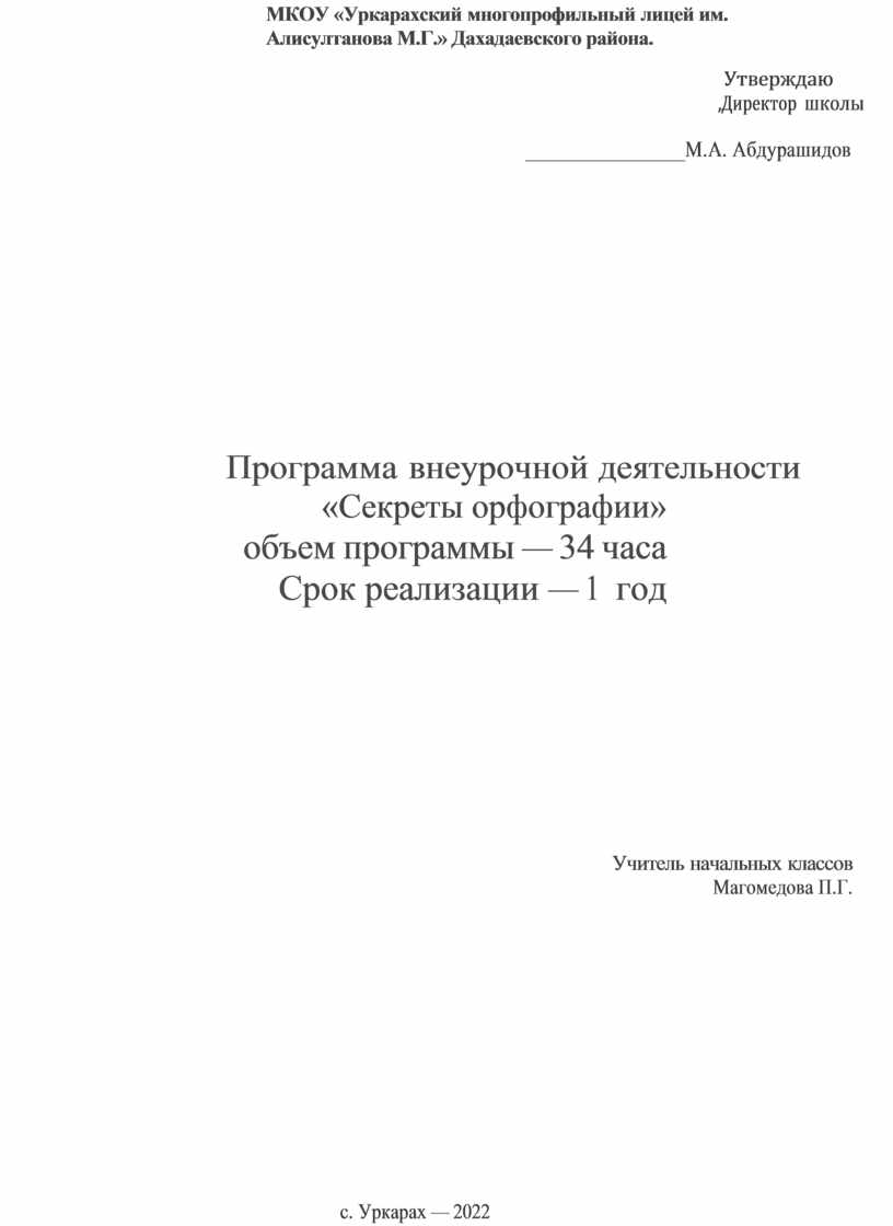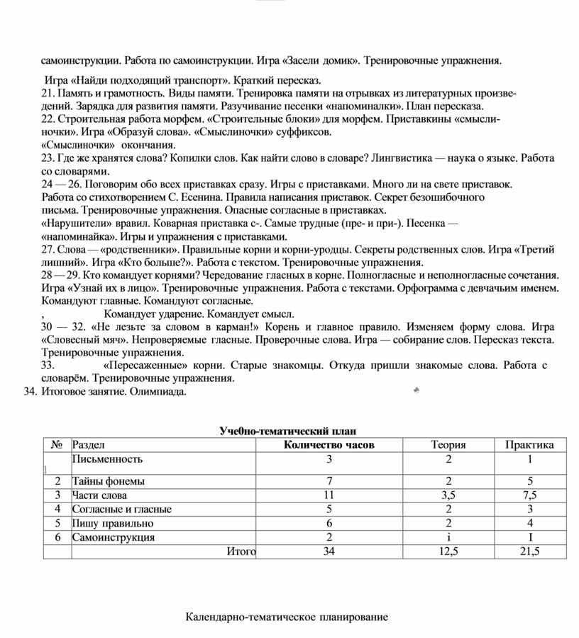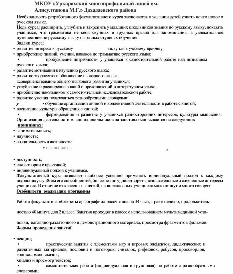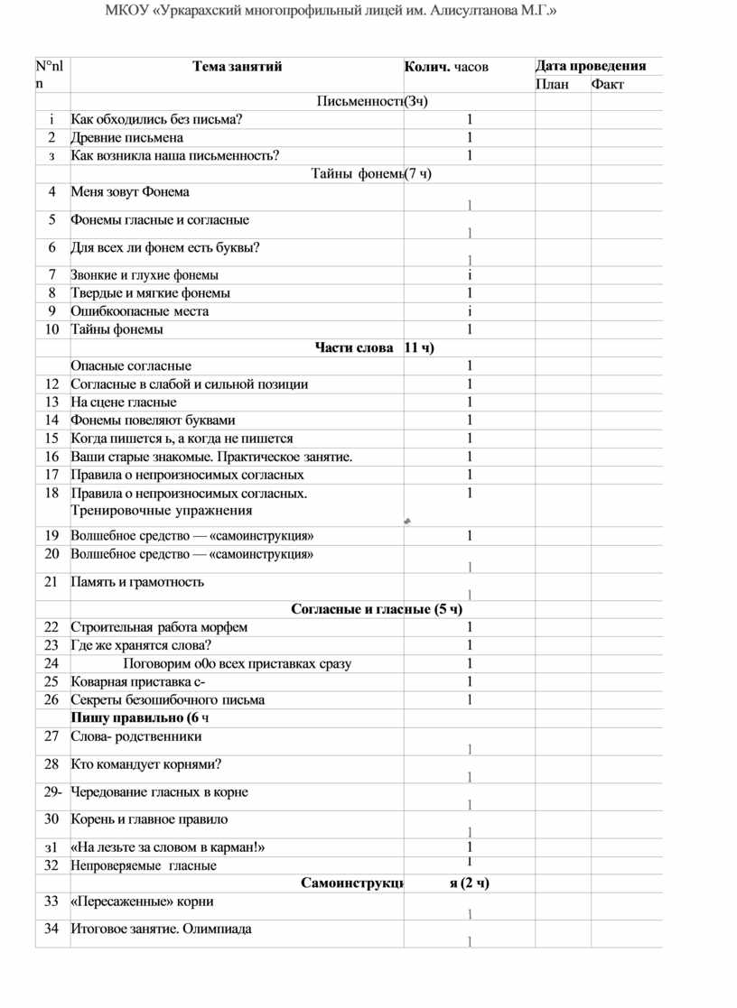 Работа факультатива «Секреты орфографии» рассчитана на 34 часа, 1 раз в неделю, продолжитель-