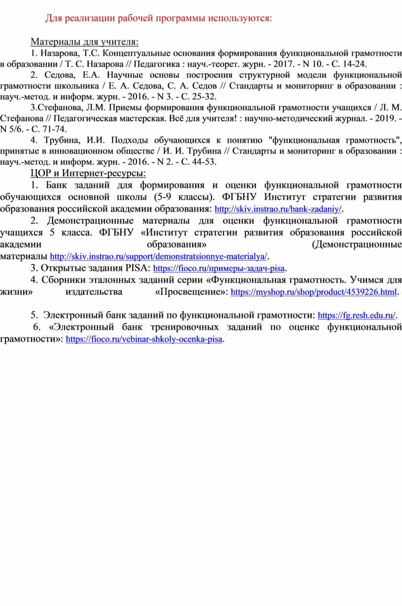 1. Назарова, Т.С. Концептуальные основания формирования функциональной грамотности в образовании / Т. С. Назарова // Педагогика : науч.-теорет. журн. - 2017. - N 10. - С. 14-24.