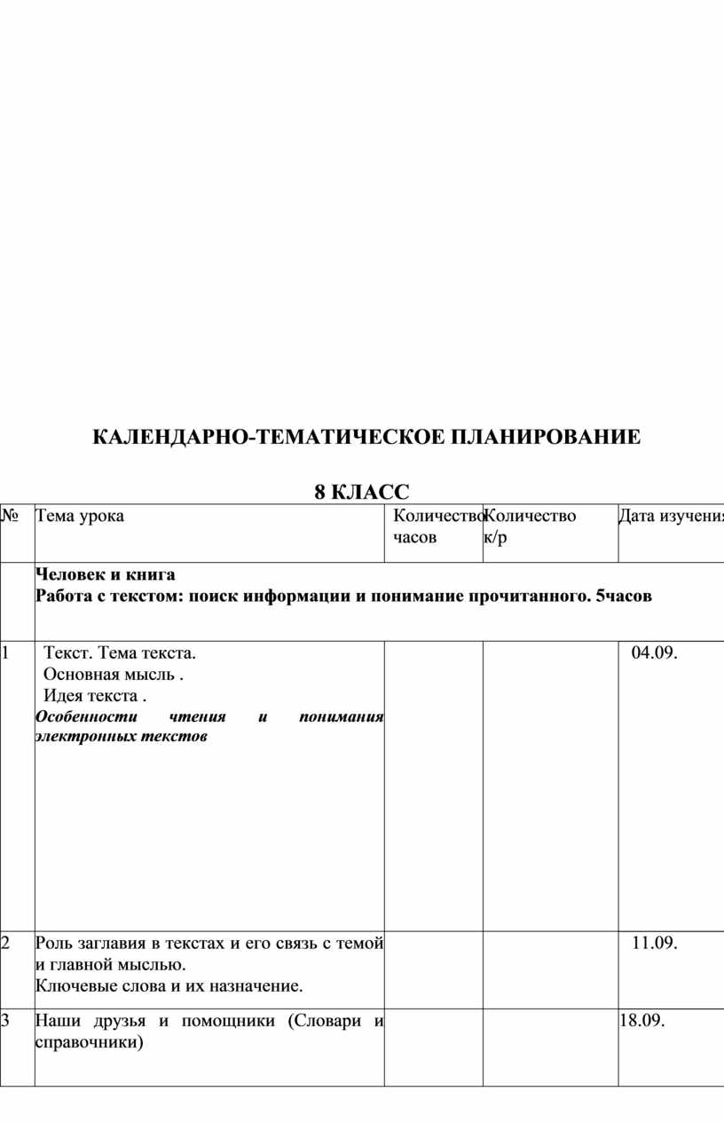 Человек и книга Работа с текстом: поиск информации и понимание прочитанного. 5часов