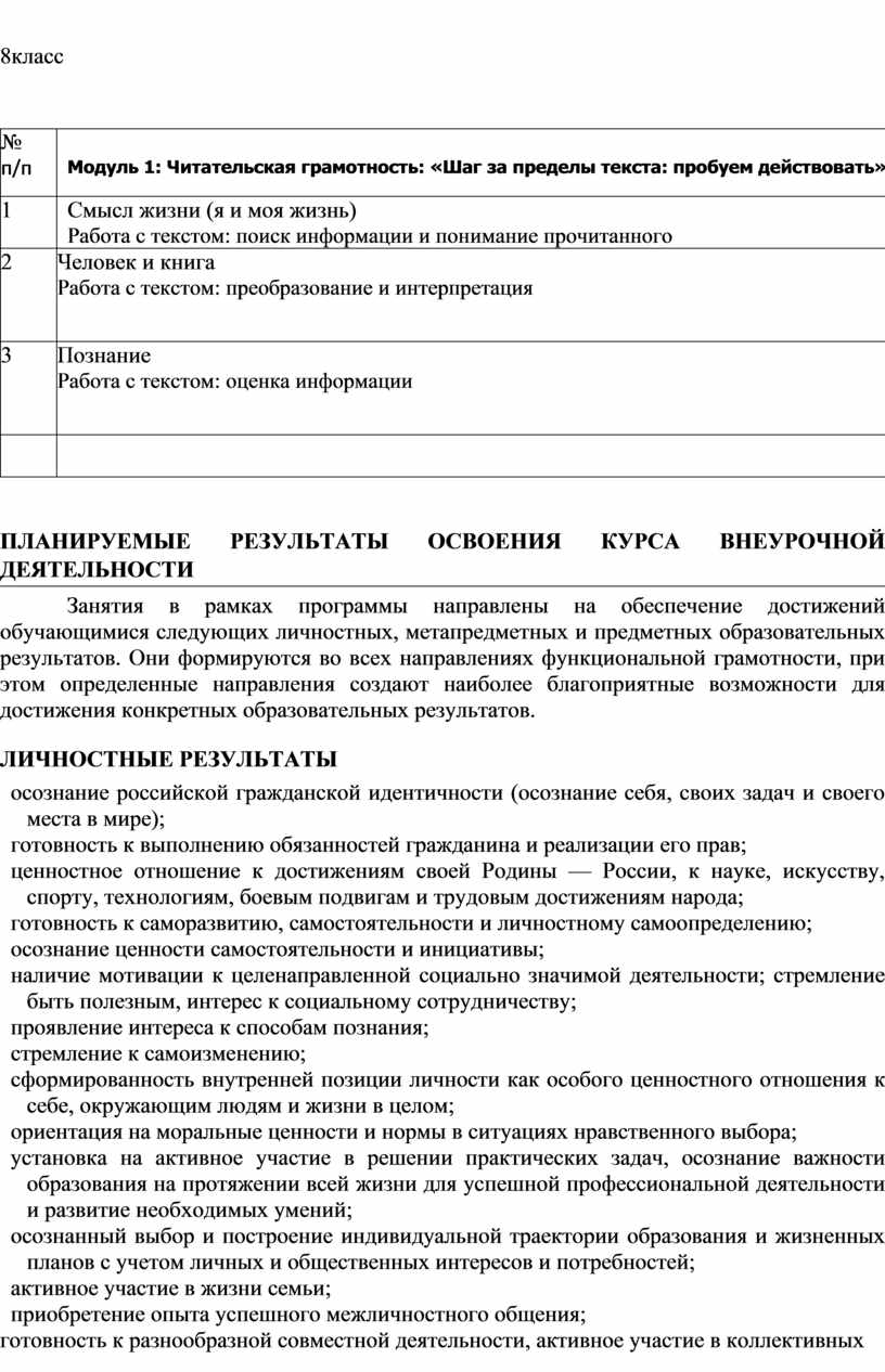 Читательская грамотность – основа формирования функциональной грамотности в целом. Особенность этого направления в том, что читательская грамотность формируется средствами разных учебных предметов и разными форматами внеурочной деятельности. Модуль «Читательская грамотность» в рамках курса предусматривает работу с текстами разных форматов (сплошными, несплошными, множественными), нацелен на обучение приемам поиска и выявления явной и скрытой, фактологической и концептуальной, главной и второстепенной информации, приемам соотнесения графической и текстовой информации, приемам различения факта и мнения, содержащихся в тексте. Занятия в рамках модуля предполагают работу по анализу и интерпретации содержащейся в тексте информации, а также оценке противоречивой, неоднозначной, непроверенной информации, что формирует умения оценивать надежность источника и достоверность информации, распознавать скрытые коммуникативные цели автора текста, в том числе манипуляции, и вырабатывать свою точку зрения.